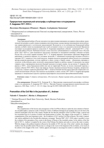 Тема Гражданской войны в России находится под пристальным вниманием историков и философов; национальной катастрофе в судьбе страны посвящены многочисленные художественные произведения писателей разных мировоззренческих и эстетических представлений. Несмотря на то что публицистика Гражданской войны огромна, особый и менее исследованный пласт в ней составляют статьи и эго-документы писателей. Предметом настоящего исследования является осмысление Л. Андреевым важнейших событий - революций 1917 г. и Гражданской войны в России. Публицистические статьи писателя, публиковавшиеся в эсеровской газете «Русская воля» (1917-1919 гг.), дают возможность проследить эволюцию его восприятия ключевых событий в истории России ХХ в. В статьях первой половины 1917 г. Л. Андреев выражает вдохновение событиями Февральской революции и стремится передать это состояние читателям. С изменением политической ситуации в России к середине 1917 г. меняется и тон статей писателя. Андреев опасается возможной гибели России из-за изменения вектора развития революции, поэтому прибегает в своих статьях к борьбе словом - убеждениям, призывам и лозунгам, чтобы побудить своих читателей к продолжению борьбы за свободу страны. К сожалению, мы можем говорить лишь о предвидении писателем будущей трагедии в истории страны, так как жизнь Л. Андреева оборвалась в 1919 г., когда Гражданская война уже шла на территории России, но носила локальный характер, а главные события 1919-1920 гг. были еще впереди. Однако эволюция взглядов Леонида Андреева, авторитетного писателя, ставшего символом революции 1905 г., окажется близкой многим представителям творческой и научной интеллигенции в России. Как показало исследование, в своих статьях 1917-1919 гг. Андреев прозорливо предвидел и эмоционально-страстно стремился предотвратить наступление братоубийственной войны.