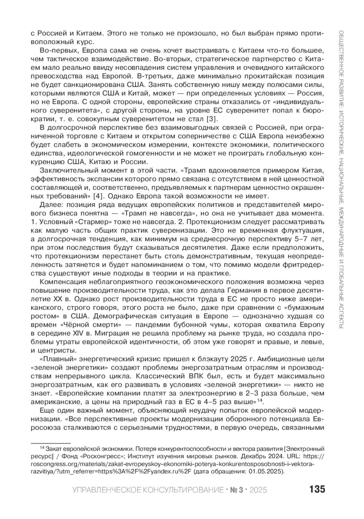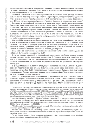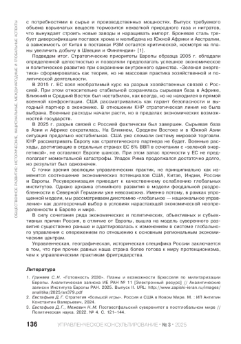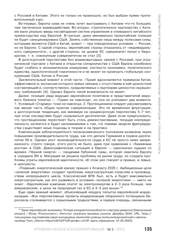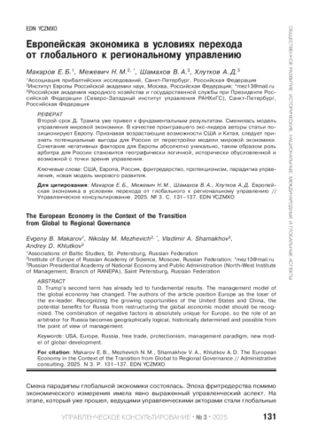 D. Trump’s second term has already led to fundamental results. The management model of the global economy has changed. The authors of the article position Europe as the loser of the ex-leader. Recognizing the growing opportunities of the United States and China, the potential benefits for Russia from restructuring the global economic model should be recognized. The combination of negative factors is absolutely unique for Europe, so the role of an arbitrator for Russia becomes geographically logical, historically determined and possible from the point of view of management.