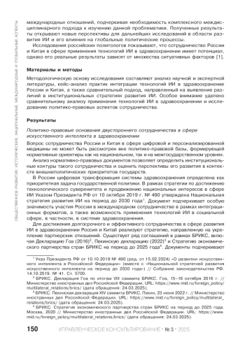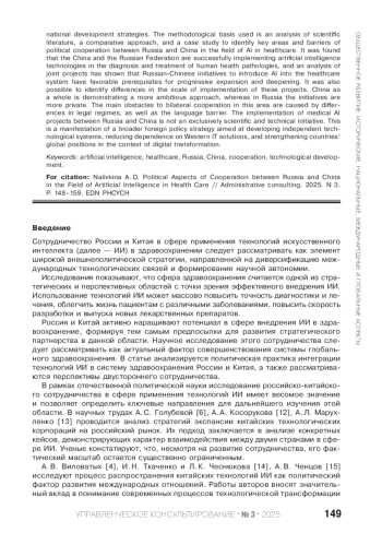 Статья посвящена рассмотрению текущих форм взаимодействия России и Китая в сфере применения технологий искусственного интеллекта в здравоохранении и выявлению векторов их возможного развития. Цель статьи заключается в анализе политических условий и механизмов двустороннего сотрудничества России и Китая в сфере применения технологий искусственного интеллекта в здравоохранении с опорой на кейс-анализ, обзор нормативной базы и сравнительное изучение национальных стратегий развития. В качестве методологической базы использованы анализ научной литературы, сравнительный подход и кейс-анализ, позволяющие выявить ключевые направления и барьеры политического сотрудничества России и Китая в области применения ИИ в здравоохранении. Было установлено, что Китай и Россия успешно внедряют технологии искусственного интеллекта в диагностику и лечение заболеваний, а анализ совместных проектов показал, что российско-китайские инициативы по внедрению искусственного интеллекта в систему здравоохранения обладают благоприятными предпосылками для развития. Также удалось выявить различия в масштабах реализации этих проектов. Китай в целом демонстрирует более масштабный подход, тогда как в России инициативы носят более локальный характер. Основные препятствия на пути двустороннего сотрудничества в этой области обусловлены различиями в правовых режимах, а также языковым барьером. Совместная реализация ИИ-проектов в здравоохранении России и Китая не является исключительно научно-технической инициативой. Это проявление более широкой внешнеполитической стратегии, направленной на развитие независимых технологических систем, снижение зависимости от западных ИТ-решений и укрепление глобальных позиций стран в условиях цифровой трансформации.
