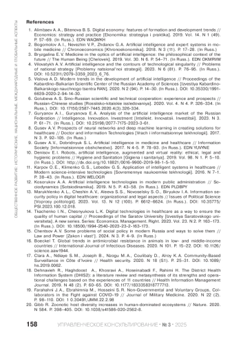 2. Богомолов А. И., Невежин В. П., Жданов Г. А. Искусственный интеллект и экспертные системы в мобильной медицине // Хроноэкономика. 2018. № 3 (11). С. 17-28. EDN: XUXVFB