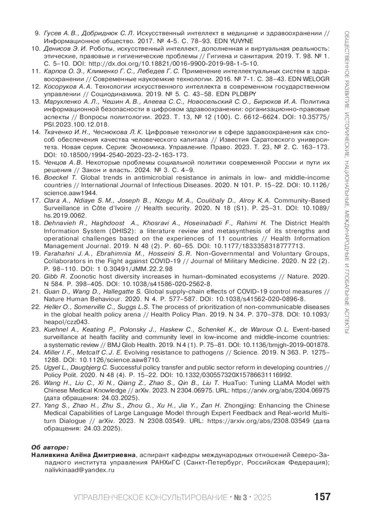 9. Гусев А. В., Добриднюк С. Л. Искусственный интеллект в медицине и здравоохранении // Информационное общество. 2017. № 4-5. С. 78-93. EDN: YUVYNE