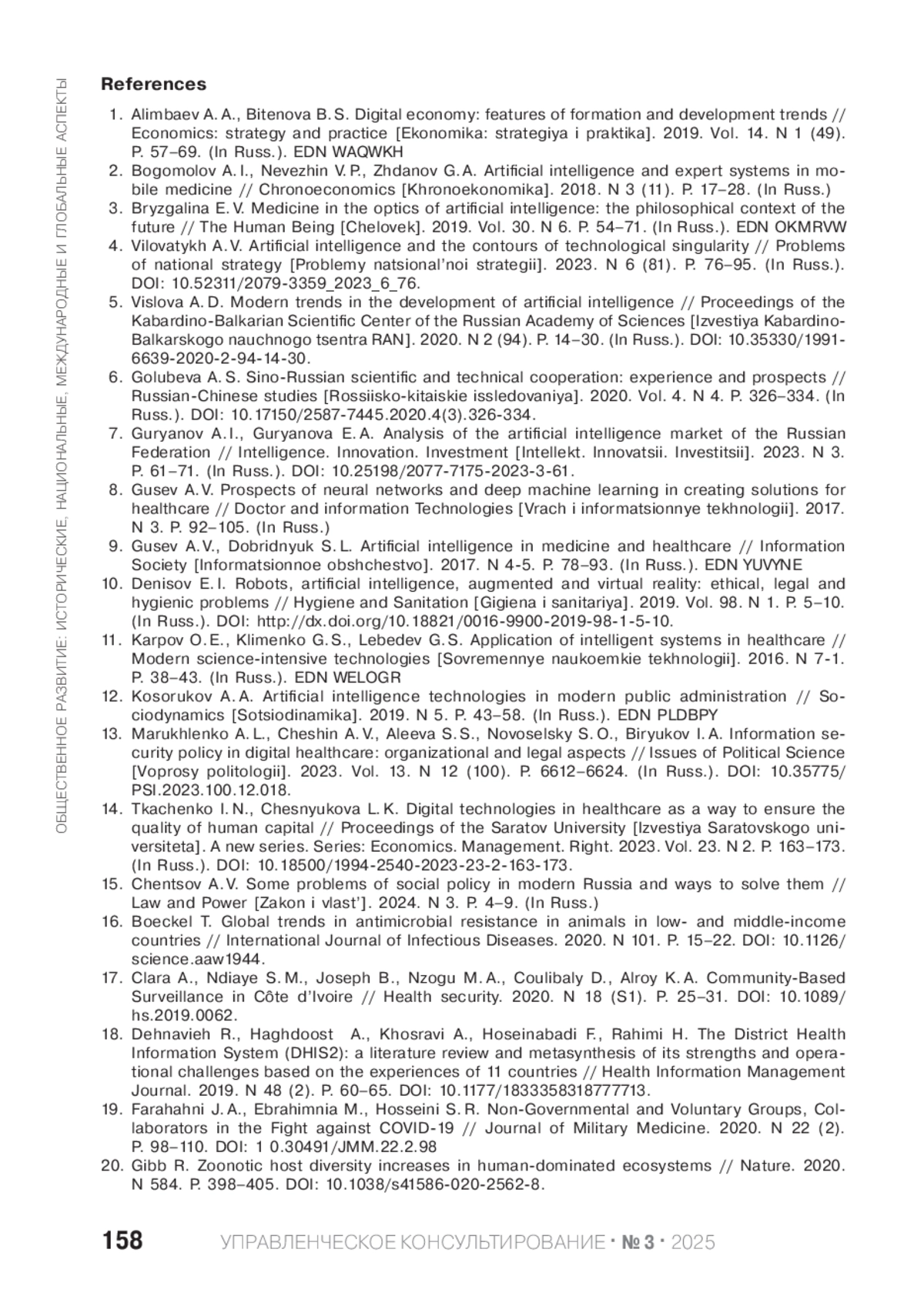 3. Брызгалина Е. В. Медицина в оптике искусственного интеллекта: философский контекст будущего // Человек. 2019. Т. 30. № 6. С. 54-71. EDN: OKMRVW