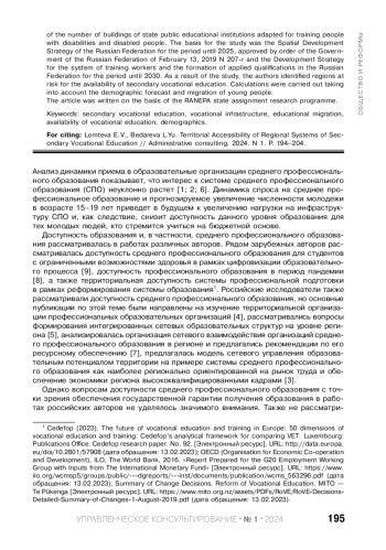 В статье рассмотрены вопросы развития инфраструктуры региональных систем среднего профессионального образования, а также территориальная доступность профессиональных образовательных организаций для молодежи. В рамках исследования авторы рассматривают соблюдение государственных гарантий реализации права молодежи на профессиональное образование в части обеспеченности бюджетными местами в образовательных организациях среднего профессионального образования и местами в общежитиях, а также допустимое значение удельного веса числа зданий государственных профессиональных образовательных организаций, приспособленных для обучения лиц с ограниченными возможностями здоровья и инвалидов. Основанием для исследования послужили Стратегия пространственного развития Российской Федерации на период до 2025 года, утверждена распоряжением Правительства Российской Федерации от 13 февраля 2019 г. № 207-р1 и Стратегии развития системы подготовки рабочих кадров и формирования прикладных квалификаций в РФ на период до 2030 г.2 В результате проведенного исследования авторами были выявлены регионы, находящиеся в группе риска по доступности среднего профессионального образования. Расчеты проводились с учетом демографического прогноза и миграции молодежи. Статья подготовлена в рамках выполнения научно-исследовательской работы государственного задания РАНХиГС.