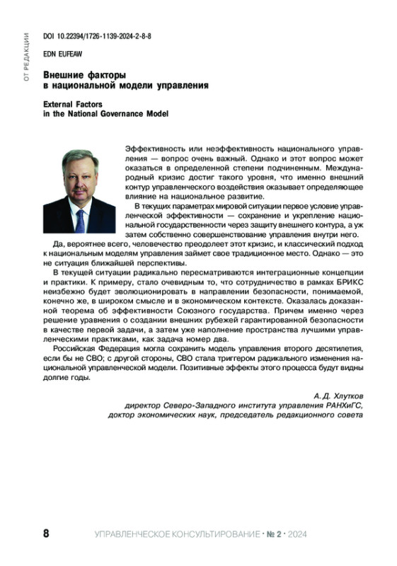 ХЛУТКОВ А. Д. ВНЕШНИЕ ФАКТОРЫ В НАЦИОНАЛЬНОЙ МОДЕЛИ УПРАВЛЕНИЯ // УПРАВЛЕНЧЕСКОЕ КОНСУЛЬТИРОВАНИЕ. 2024. № 2 (182)
