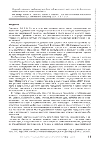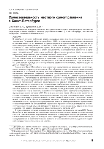 В новейшей истории публичная власть расширила свое политологическое и правовое толкование. Поправкой к Конституции РФ от 2020 г. о совершенствовании регулирования отдельных вопросов организации и функционирования публичной власти, органы местного самоуправления (далее - органы МСУ) были отнесены к органам публичной власти. Согласно ст. 132 Конституции РФ органы МСУ вошли в единую систему публичной власти в Российской Федерации и стали осуществлять взаимодействие совместно с органами государственной власти для наиболее эффективного решения задач в интересах населения, проживающего на соответствующей территории. Европейской хартией о местном самоуправлении определена, а Конституцией России закреплена историческая и правовая основа установления местного самоуправления на определенной территории - его самостоятельность. При этом должны учитываться культурные и исторические особенности жителей, проживающих на данных территориях. Население Санкт-Петербурга через местное самоуправление реализует конституционное право на осуществление власти. Оно обладает своим культурным кодом, который выражается в особенной истории, местных обычаях и традициях, многонациональным населением, множестве конфессий. Местное самоуправление представлено 111 внутригородскими муниципальными образованиями (далее - ВМО) и 1 Советом муниципальных образований. Регулирование деятельности местного самоуправления осуществляется законом об организации местного самоуправления в Санкт-Петербурге. От качества исполнения полномочий местным самоуправлением зависит степень реализации права жителей на власть, а значит, и на политическую стабильность в регионе. Муниципальные выборы 2019 г. изменили качественные составы представительных органов, дополнив их самостоятельными несистемными депутатами. Данное обстоятельство позволило иначе взглянуть на особенности деятельности местного самоуправления, функционирования органов МСУ. По мнению авторов, такое обновление является не столько желанием населения мегаполиса сменить составы представительных органов, сколько следствием последовательной государственной политики по сокращению полномочий органов МСУ. После встраивания местного самоуправления в систему органов публичной власти, городская государственная власть в целях установления эффективного взаимодействия не осуществляет нормативно-правовое совершенствование межинституционных отношений, а консолидирует экономические механизмы решения местных вопросов, что ведет к сокращению самостоятельности органов МСУ. В статье сделана попытка определить уровень самостоятельности органов МСУ Санкт-Петербурга, направление вектора нормативно-правового регулирования государственной власти в отношении конституционного института, подвергнуть анализу результаты полученных материалов, сделать выводы и дать оценку уровню самостоятельности местного самоуправления в политологическом аспекте, а также возможным последствиям подобной государственной политики на местах. Целью настоящей статьи является научное обоснование необходимости принятия определенных решений органами государственной власти с целью недопущения уменьшения самостоятельности местного самоуправления в Санкт-Петербурге, а также увеличения относительной автономи