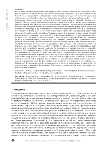 In a number of works by domestic and foreign authors, modern methods are proposed to solve the problem of the effectiveness of decision-making and execution. Quite satisfactory results have been achieved both in theoretical, methodological and applied terms. However, this only casually mentions the effect that occurs in any, and not only an unrealized solution - the appearance of some remnants; not unrealization, but fundamental unrealizability without a remainder. The very nature of unrealizability or the presence of residual has not been considered before, although the effect of residual is constantly observed. The discrepancy between the solution and its implementation was associated with the insufficient quality of the solution or with the shortcomings of its implementation, which is considered in the context of “incomplete information” and “the presence of hidden variables/factors”. This understanding allowed the remnants themselves to be considered in several angles and aspects: a) as a residue from the implementation (“unrealized opportunities”), b) as an over-realization of realized opportunities, c) as errors in the development of solutions, d) as technical, organizational, etc. disadvantages in the implementation of the solution, etc. However, the immediate consideration of the problem of evaluating the effectiveness of decision-making indicates the presence of a fundamental unrealizability in it, which is expressed in the appearance of a remainder when it is implemented in any case. Moreover, this remainder is not associated with realizability as such and not with the solution as such, but with the presence of a special property of residuality, which is of a fundamental nature. The purpose is to identify, describe and propose a method for assessing the phenomenon associated with the incompleteness of the implementation of a management decision, regardless of its quality. A set of logical and descriptive methods was used in the study. Results: a review of situations with the appearance of residues in decisionmaking is carried out; a criterion and a method for evaluating the effectiveness of decisionmaking is proposed, a rule for the residual implementation of a decision is formulated; a justification of the proposed rule in various aspects is given; a classification of options for the unrealizability of decisions is proposed. The results obtained can be useful in making and implementing a decision.