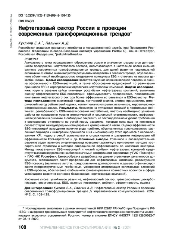 10. Куклина Е. А. К вопросу применения инструментов ESG-инвестирования (в контексте цифровой и “зеленой” трансформации нефтегазовой отрасли Российской Федерации) / Государство и бизнес. Направления социально-экономического развития: материалы XV Международной научно-практической конференции. Санкт-Петербург, 26-27 апреля 2023 г. В 2 т. Т. 1. СПб.: ИПЦ СЗИУ РАНХиГС, 2023. С. 67-79. EDN: LBXIHH