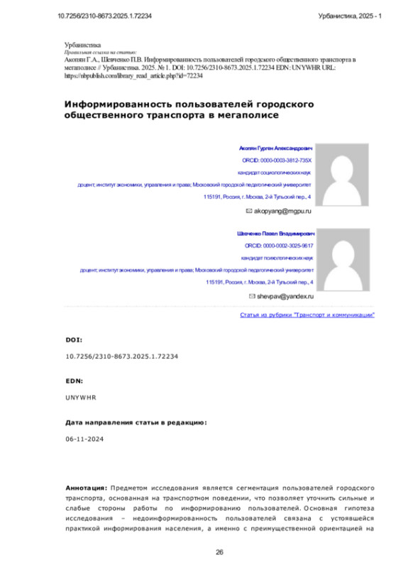АКОПЯН Г. А., ШЕВЧЕНКО П. В. ИНФОРМИРОВАННОСТЬ ПОЛЬЗОВАТЕЛЕЙ ГОРОДСКОГО ОБЩЕСТВЕННОГО ТРАНСПОРТА В МЕГАПОЛИСЕ // УРБАНИСТИКА. 2025. № 1