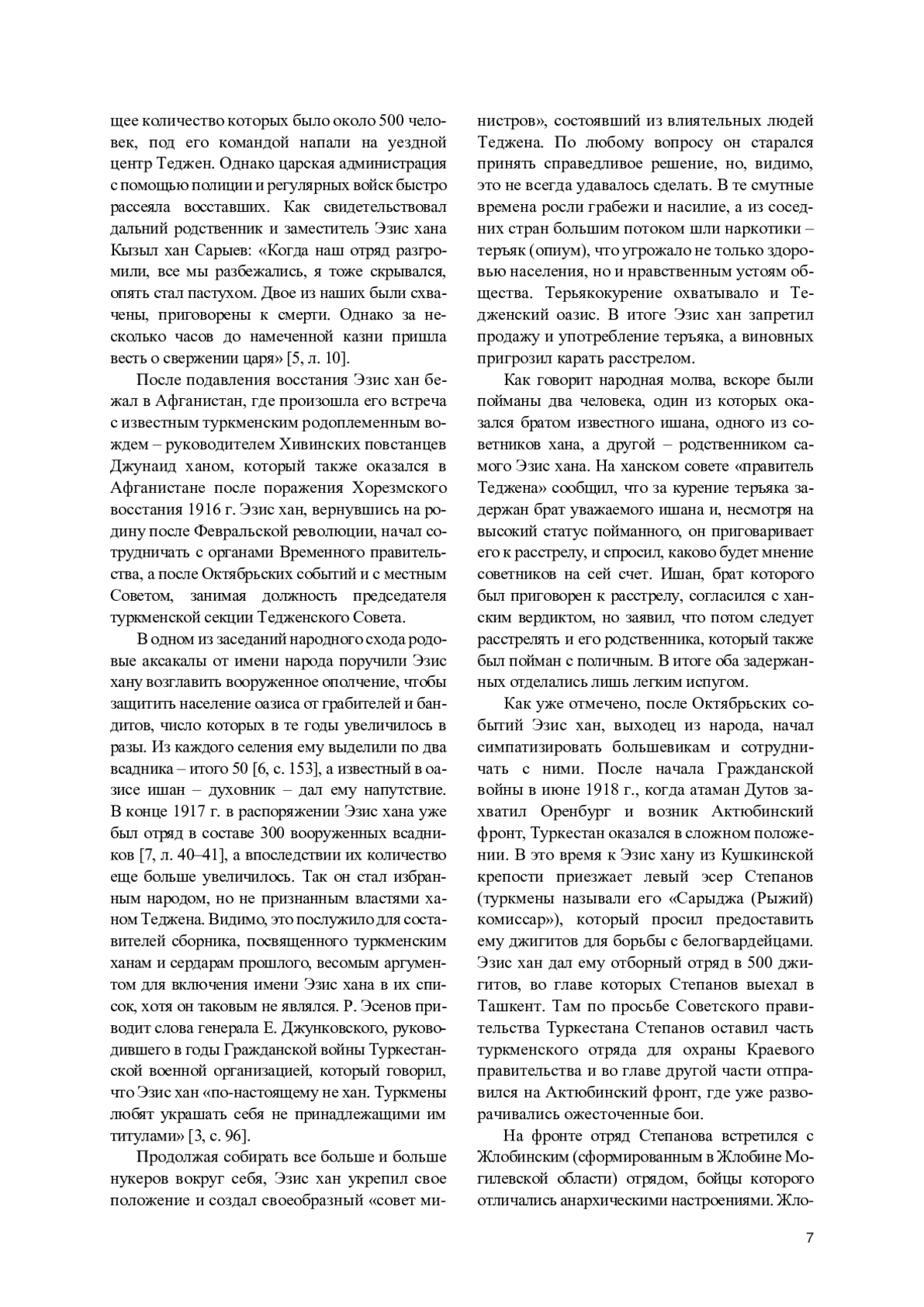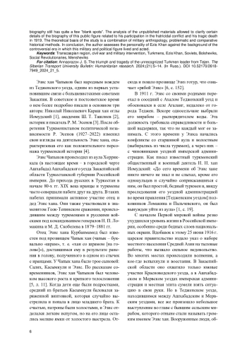 Первая мировая война, революционные события 1917 г. и последовавшая за ними Гражданская война 1918-1920 гг. оставили неизгладимый след в истории России. Эти годы отличались крайней противоречивостью и полнотой драматизма. В орбиту этих событий были вовлечены многие народы Российской империи, в том числе и туркмены, которые принимали непосредственное участие в этих драматических событиях. Однако, несмотря на важные перемены, произошедшиe на туркменской земле после ее включения в состав Российской империи, сами туркмены в своем развитии продолжали оставаться почти на стадии общинно-родового строя. В силу этого туркменская элита не всегда понимала суть происходивших вокруг военно-политических событий. Поэтому в начальный период Гражданской войны подавляющее большинство туркмен выступало за старую власть, так как к ней уже успели привыкнуть, а наименьшая ее часть - за власть большевиков. В статье на основе ранее неопубликованных источников из фондов государственных и ведомственных архивов прослеживается жизненный путь одного из активных участников Гражданской войны в Туркменистане 1918-1920 гг., народного вождя из Тедженского оазиса Эзис хана Чапыкова (1887-1919), в биографии которого до сих пор присутствует немало «белых пятен». На основе этих материалов уточнены отдельные детали биографии указанного деятеля, связанные с его участием в братоубийственном противостоянии и трагической гибели в 1919 г. Теоретическая основа исследования -сочетание военной антропологии, проблемного и сравнительно-исторического методов. Подводя итоги, автор дает оценку личности Эзис хана на фоне противоречивой эпохи, в которую жил этот военный и политический деятель.