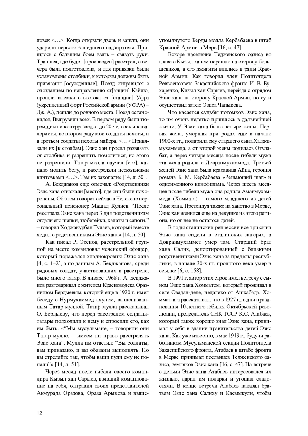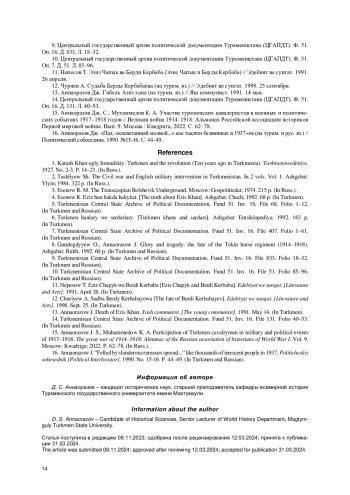 15. Аннаоразов Дж. С., Мухаммедов К. А. Участие туркменских кавалеристов в военных и политических событиях 1917-1918 годов // Великая война 1914-1918: Альманах Российской ассоциации историков Первой мировой войны. Вып. 9. Москва: Квадрига, 2022. С. 62-78.
