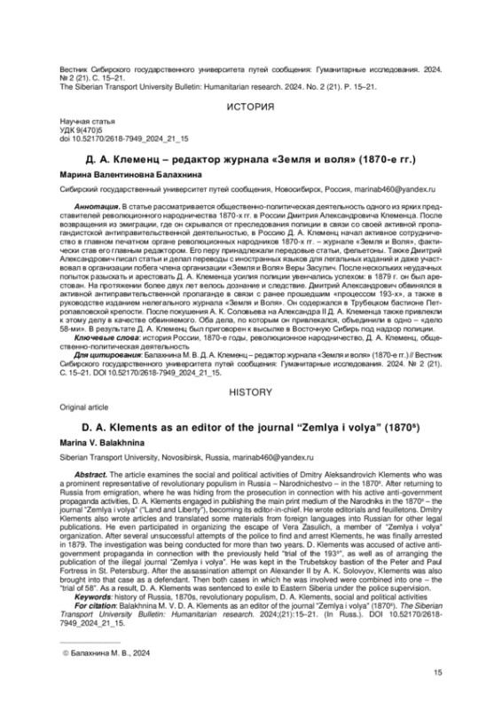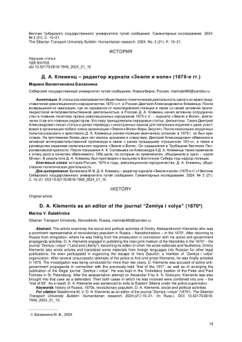 2. Балахнина М. В. Первые годы общественно-политической деятельности народника Д. А. Клеменца // Вестник Сибирского государственного университета путей сообщения. Гуманитарные исследования. 2023. № 3 (18). С. 5-11. EDN: PZXUMP