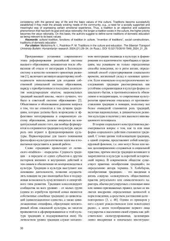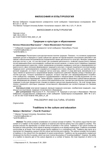 Рассмотрено культурологическое понятие традиции. Показано, что основное содержание традиции состоит в передаче от одних субъектов к другим паттернов внешних и внутренних действий и тем самым в обеспечении воспроизводства определенных форм деятельности в культуре. Функции традиций в культуре состоят в том, что они выступают как основание деятельности, позволяя осуществлять новации на уже имеющейся базе; консолидируют сообщества на всех уровнях, от малых групп (семейные традиции) до цивилизационного единства; служат механизмом интеграции индивида в культуру и формирования его идентичности. Дано описание формирования традиций в культуре с позиций социального конструктивизма. Традиции могут целенаправленно создаваться и внедряться в жизнь общества, вплоть до практики «изобретения традиций», но станет ли традиция частью культуры, зависит от ряда факторов, важнейшим из которых является органичность предлагаемой формы социального действия общему укладу и базовым ценностям культуры. Успешно приживаются традиции, которые отвечают уже сформировавшимся потребностям сообщества, например, в социально поддерживаемом и общезначимом способе выражения тех или иных эмоциональных переживаний. Таким образом, традиция является объективно-субъективным феноменом, обладающим как целевой, так и ценностной рациональностью, причем при длительном существовании традиции в культуре приоритетной становится именно ценностная рациональность. На этой основе предложено определить некоторые традиции отечественного образования как соответствующие его базовым ценностям.
