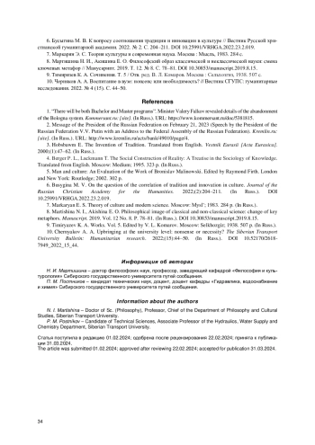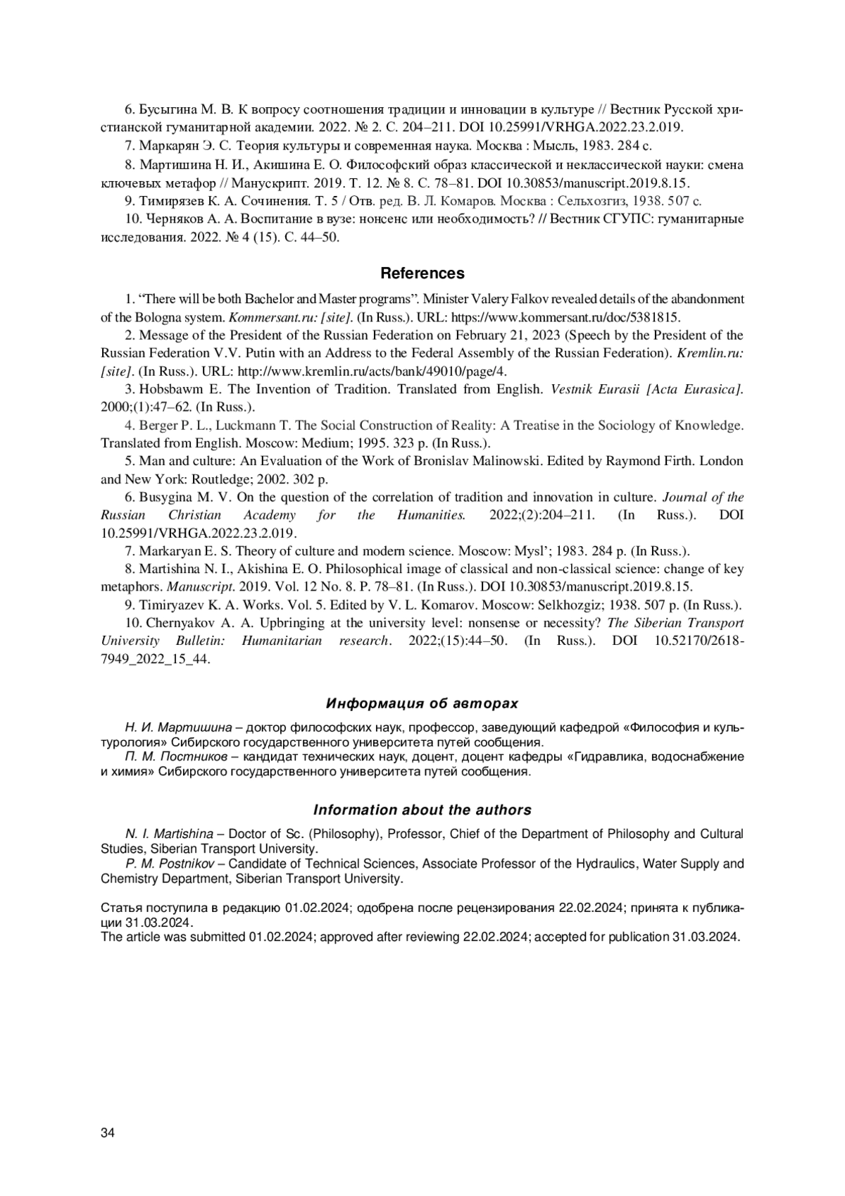 6. Бусыгина М. В. К вопросу соотношения традиции и инновации в культуре // Вестник Русской христианской гуманитарной академии. 2022. № 2. С. 204-211. DOI: 10.25991/VRHGA.2022.23.2.019 EDN: YTUKGI