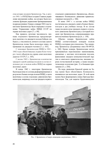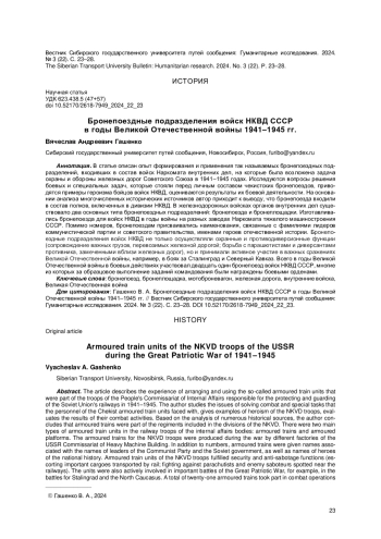 В статье описан опыт формирования и применения так называемых бронепоездных подразделений, входивших в состав войск Наркомата внутренних дел, на которые была возложена задача охраны и обороны железных дорог Советского Союза в 1941-1945 годах. Исследуются вопросы решения боевых и специальных задач, которые стояли перед личным составом чекистских бронепоездов, приводятся примеры героизма бойцов войск НКВД, оцениваются результаты их боевой деятельности. На основании анализа многочисленных исторических источников автор приходит к выводу, что бронепоезда входили в состав полков, включенных в дивизии НКВД. В железнодорожных войсках органов внутренних дел существовало два основных типа бронепоездных подразделений: бронепоезда и бронеплощадки. Изготавливались бронепоезда для войск НКВД в годы войны на разных заводах Наркомата тяжелого машиностроения СССР. Помимо номеров, бронепоездам присваивались наименования, связанные с фамилиями лидеров коммунистической партии и советского правительства, именами героев отечественной истории. Бронепоездные подразделения войск НКВД не только осуществляли охранные и противодиверсионные функции (сопровождение важных грузов, перевозимых железной дорогой; борьба с парашютистами и диверсантами противника, замеченными вблизи железных дорог), но и принимали активное участие в важных сражениях Великой Отечественной войны, например, в боях за Сталинград и Северный Кавказ. Всего в годы Великой Отечественной войны в боевых действиях участвовал двадцать один бронепоезд войск НКВД СССР, многие из которых за образцовое выполнение заданий командования были награждены боевыми орденами.