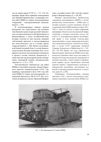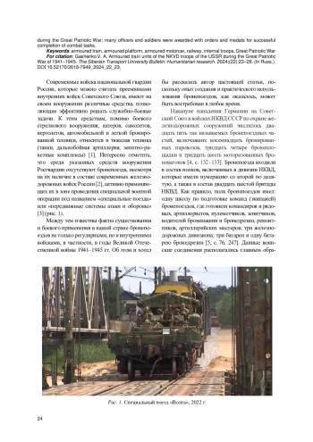 Современные войска национальной гвардии России, которые можно считать преемниками внутренних войск Советского Союза, имеют на своем вооружении различные средства, позволяющие эффективно решать служебно-боевые задачи. К этим средствам, помимо боевого стрелкового вооружения, катеров, самолетов, вертолетов, автомобильной и легкой бронированной техники, относится и тяжелая техника (танки, дальнобойная артиллерия, зенитно-ракетные комплексы) [1]. Интересно отметить, что среди указанных средств вооружения Росгвардии отсутствуют бронепоезда, несмотря на их наличие в составе современных железнодорожных войск России [2], активно применяющих их в зоне проведения специальной военной операции под названием «специальные поезда» или «передвижные системы атаки и обороны» [3] (рис. 1).