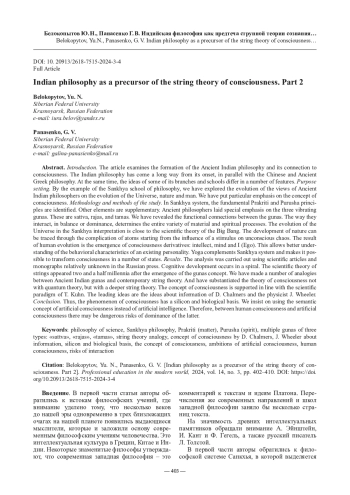 Введение. В статье рассматриваются формирование древней индийской философии, ее связь с сознанием. От зарождения она прошла долгий путь параллельно с философией Китая и Античной Греции. В то же время идеи некоторых ее направлений и школ отличаются рядом особенностей.