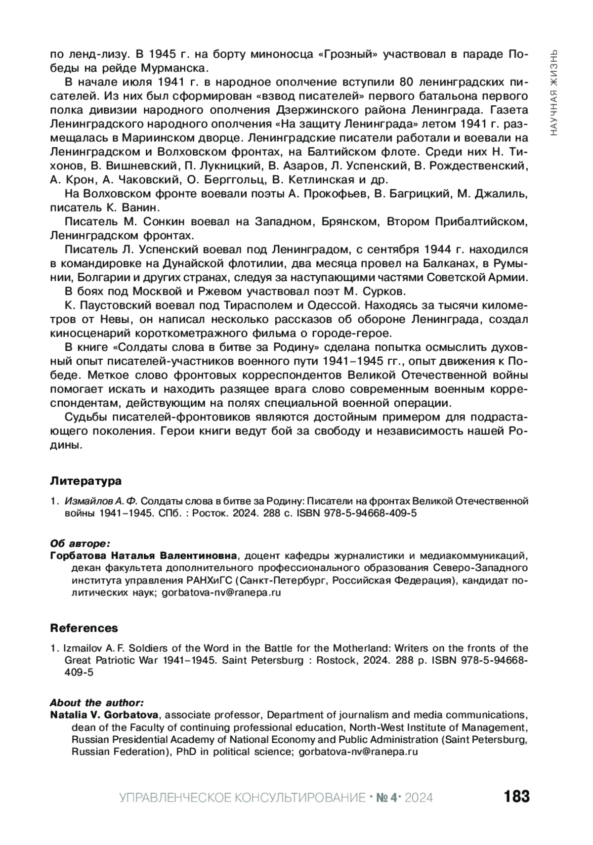 В Научную библиотеку СЗИУ поступила новая книга А. Измайлова «Солдаты слова в битве за Родину. Писатели на фронтах Великой Отечественной войны 1941–1945 гг.». Альберт Федорович Измайлов — житель блокадного Ленинграда, кандидат филологических наук, автор 30 книг документальной прозы, член Союза писателей России, лауреат литературных премий.