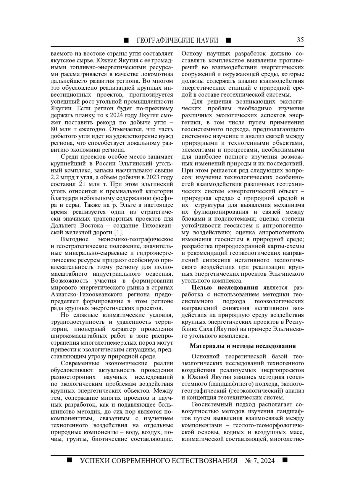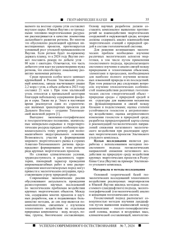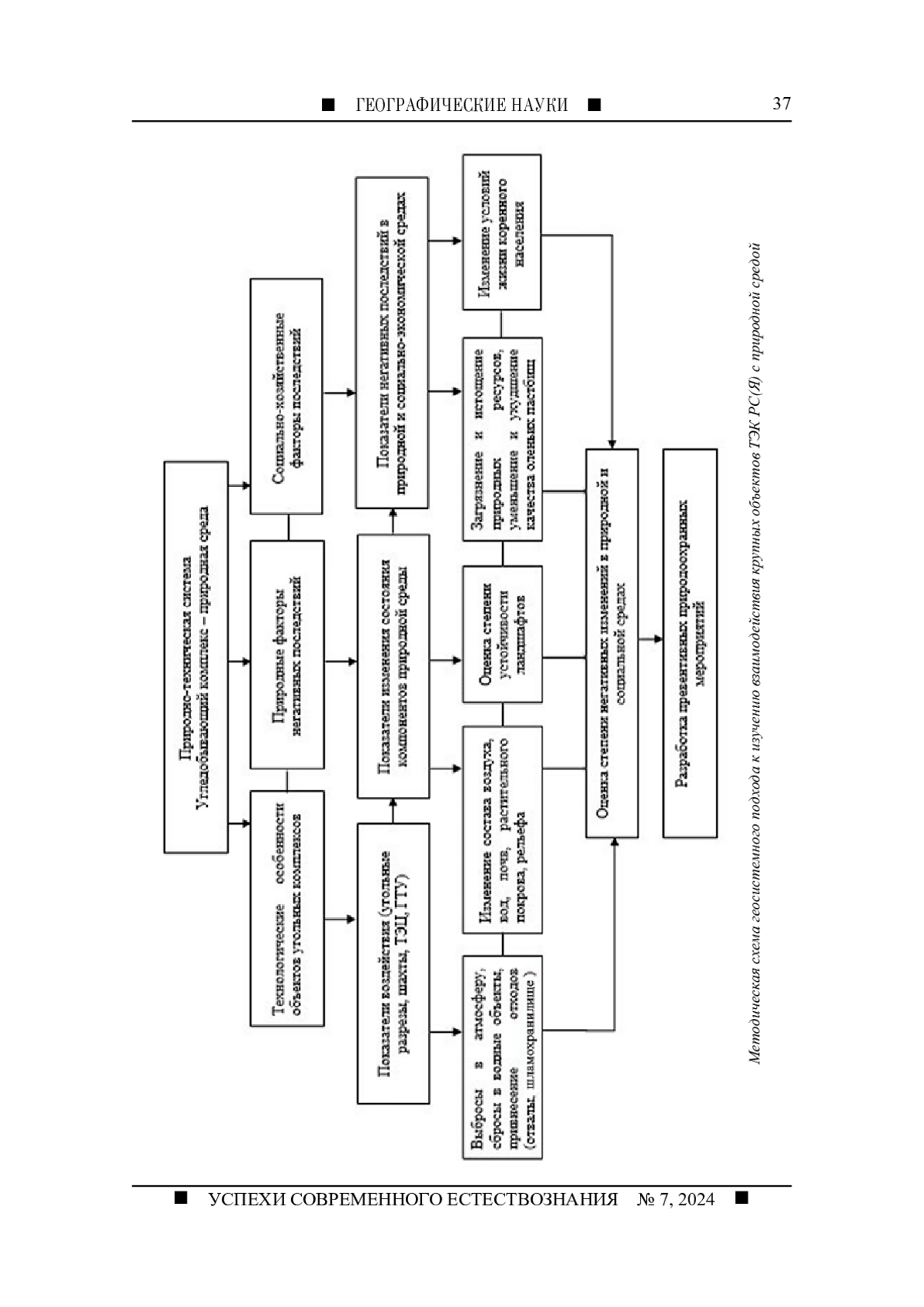 Якутия является регионом, богатым различными природными, в том числе топливно-энергетическими, ресурсами. Разработка угольных месторождений вызывает техногенное нарушение природной среды, что определяет актуальность научных исследований по минимизации последствий нарушения экологического баланса территорий промышленного освоения. Содержание многих научных разработок является покомпонентным, направленным на изучение отдельных компонентов природы, в то время как исследование должно базироваться на комплексной геосистемной основе. В статье использованы комплексные системные методики ландшафтного анализа и геотехнических систем. Целью статьи является разработка схемы комплексного геосистемного анализа составляющих взаимодействия Эльгинского угольного комплекса и природной среды как угледобывающей геотехнической системы, который необходим для выбора направлений снижения негативного экологического воздействия на природные ландшафты. Показатели схемы характеризуют изучение производственного воздействия на изменение воздушной и водной сред, дают оценку степени устойчивости ландшафтов и оценку антропогенного изменения территории на ландшафтном уровне. В целом исследование взаимодействия между крупными объектами энергетики и природной средой на основе геосистемного подхода может лечь в основу разработки направлений снижения негативного экологического воздействия и природосберегающих мероприятий, дифференцированных по ландшафтным комплексам.