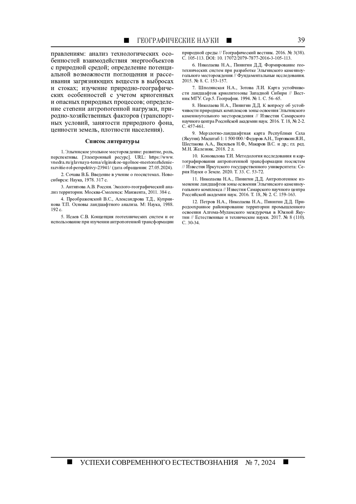11. Николаева Н.А., Пинигин Д.Д. Антропогенное изменение ландшафтов зоны освоения Эльгинского каменноугольного комплекса // Известия Самарского научного центра Российской академии наук. 2016. Т. 18, № 2. С. 159-163. EDN: WKPITZ