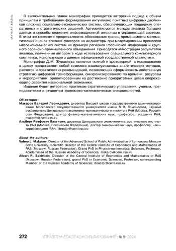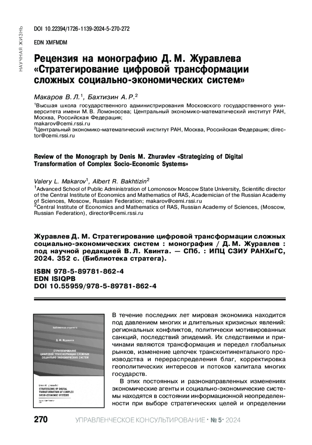 МАКАРОВ В. Л., БАХТИЗИН А. Р. РЕЦЕНЗИЯ НА МОНОГРАФИЮ Д. М. ЖУРАВЛЕВА "СТРАТЕГИРОВАНИЕ ЦИФРОВОЙ ТРАНСФОРМАЦИИ СЛОЖНЫХ СОЦИАЛЬНО-ЭКОНОМИЧЕСКИХ СИСТЕМ" // УПРАВЛЕНЧЕСКОЕ КОНСУЛЬТИРОВАНИЕ. 2024. № 5 (185)
