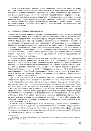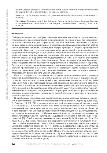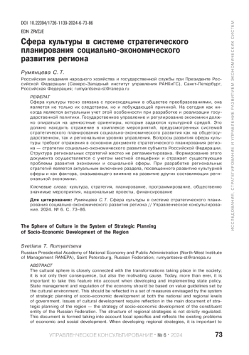 The cultural sphere is closely connected with the transformations taking place in the society; it is not only their consequence, but also the motivating cause. Today, more than ever, it is important to take this feature into account when developing and implementing state policy. State management and regulation of the economy should be based on value guidelines set by the cultural environment. This should be reflected in a set of measures envisaged by the system of strategic planning of socio-economic development at both the national and regional levels of government. Issues of cultural development require reflection in the main document of strategic planning of the region - the strategy of socio-economic development of the constituent entity of the Russian Federation. The structure of regional strategies is not strictly regulated. This document is formed taking into account local specifics and reflects the existing problems of economic and social development. When developing regional strategies, it is important to include a section devoted to the development of the cultural sphere as a factor influencing the development of other components of the regional economy.