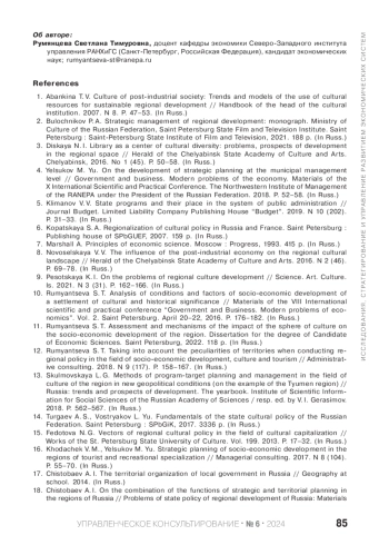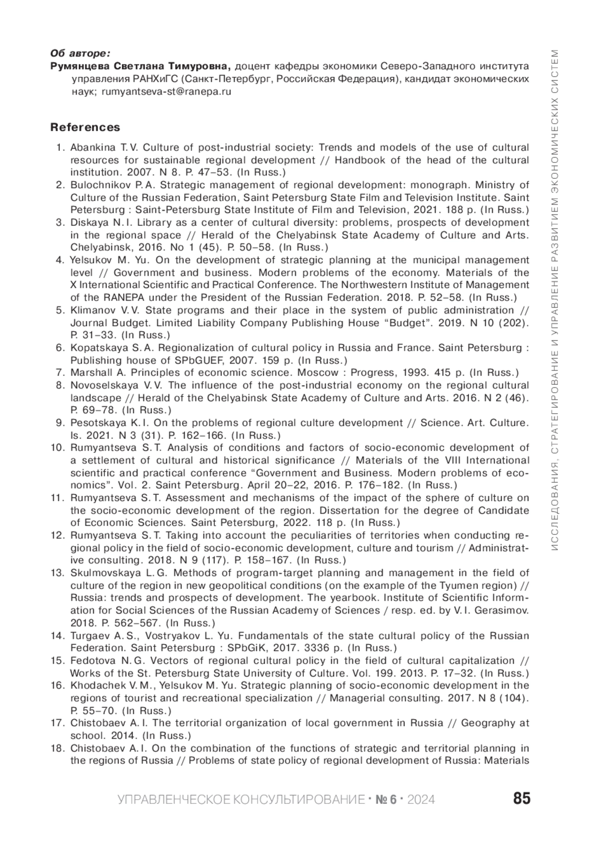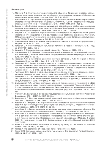 1. Абанкина Т. В. Культура постиндустриального общества: Тенденции и модели использования культурных ресурсов для устойчивого регионального развития // Справочник руководителя учреждения культуры. 2007. № 8. С. 47-53.