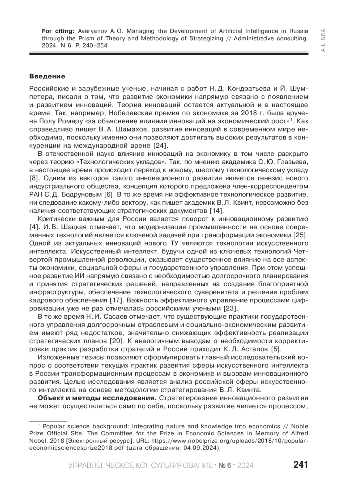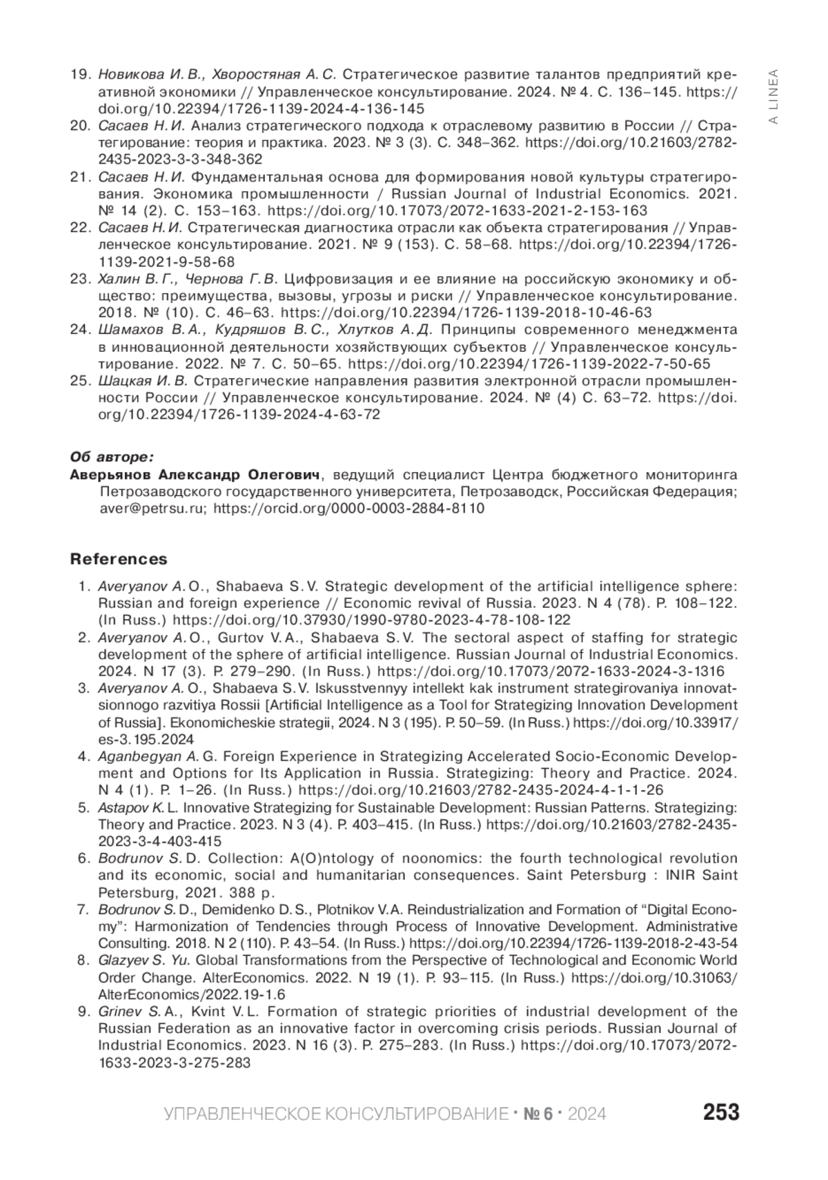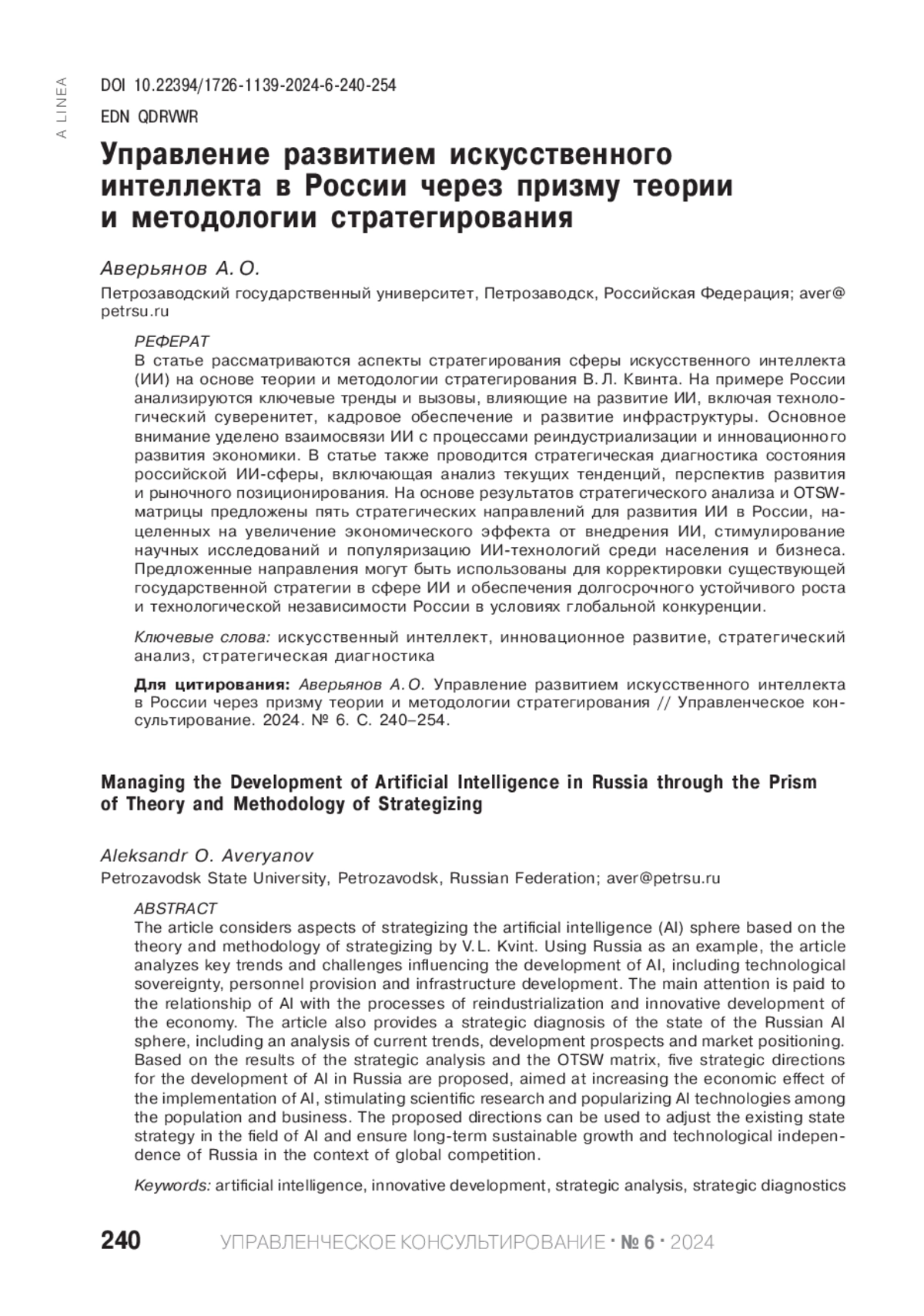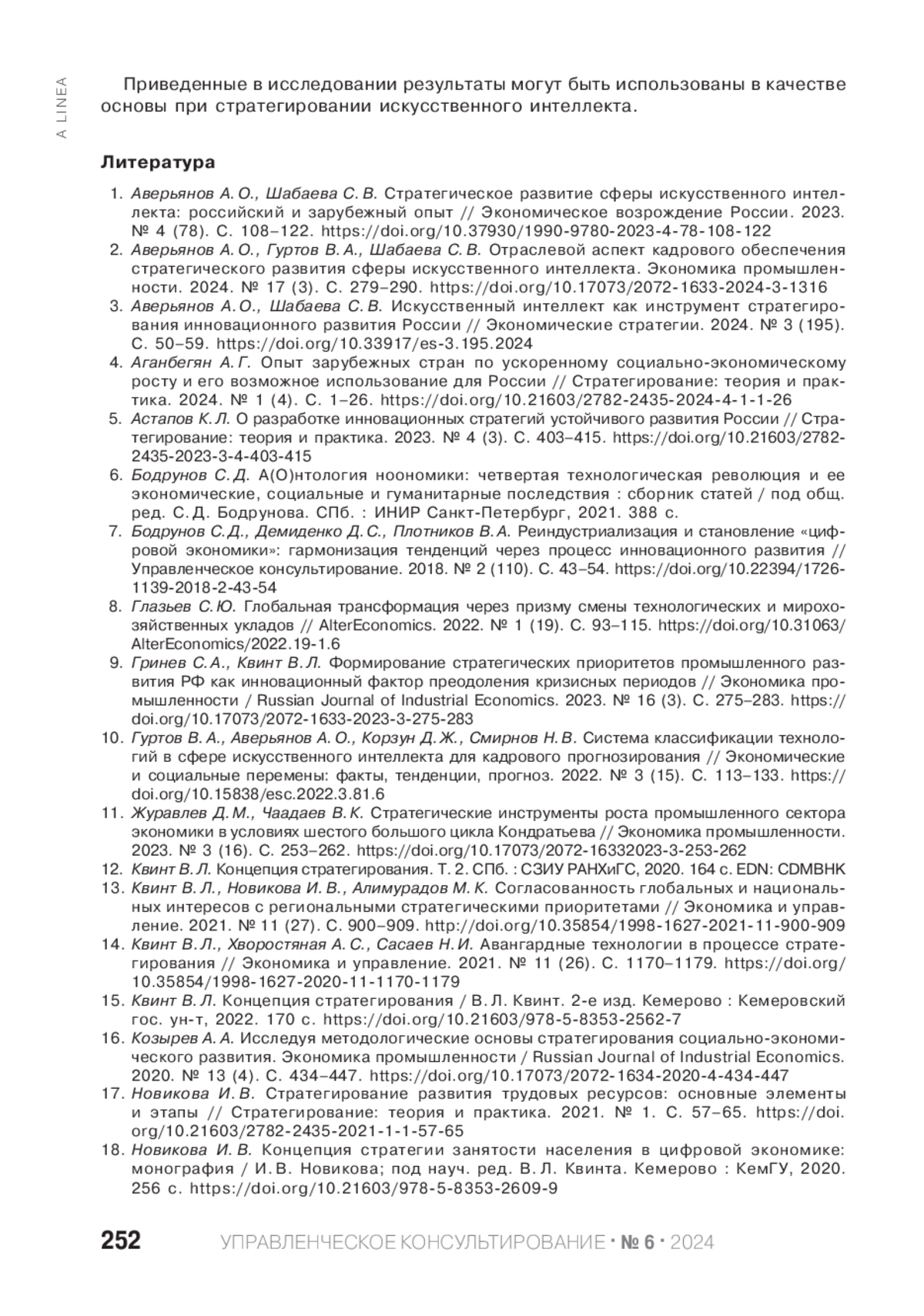 3. Аверьянов А. О., Шабаева С. В. Искусственный интеллект как инструмент стратегирования инновационного развития России // Экономические стратегии. 2024. № 3 (195). С. 50-59. DOI: 10.33917/es-3.195.2024 EDN: QYQCPU