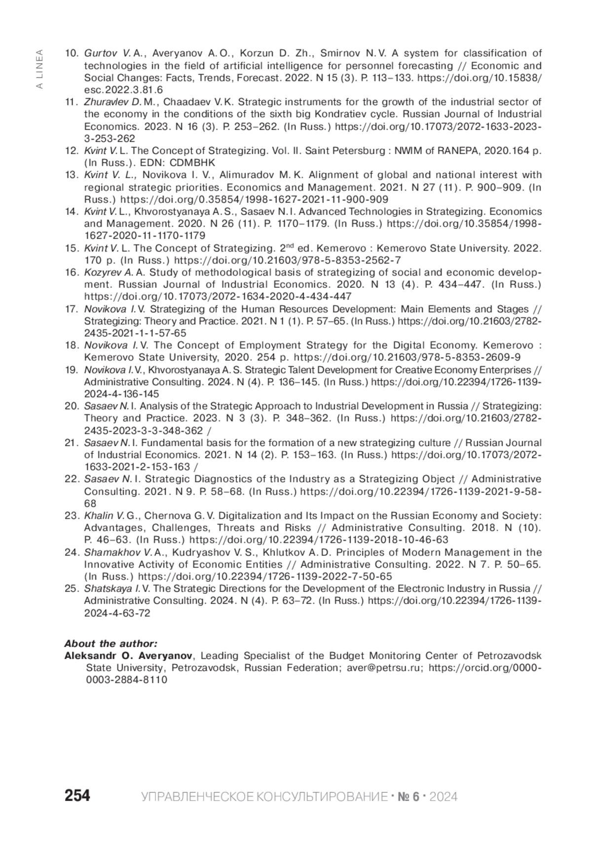 20. Сасаев Н. И. Анализ стратегического подхода к отраслевому развитию в России // Стратегирование: теория и практика. 2023. № 3 (3). С. 348-362. DOI: 10.21603/27822435-2023-3-3-348-362 EDN: IOEPIY