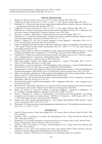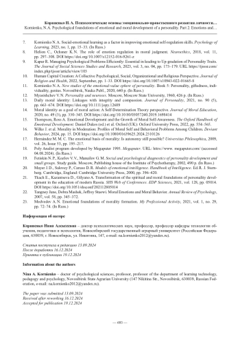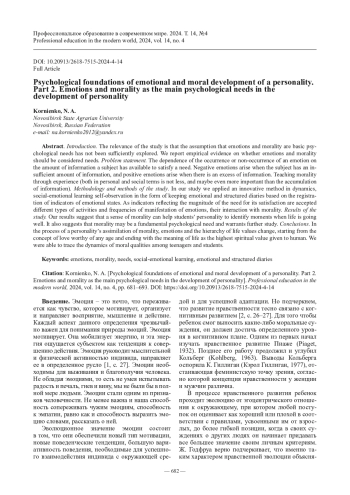 КОРНИЕНКО Н. А. ПСИХОЛОГИЧЕСКИЕ ОСНОВЫ ЭМОЦИОНАЛЬНО-НРАВСТВЕННОГО РАЗВИТИЯ ЛИЧНОСТИ. ЧАСТЬ 2. ЭМОЦИИ И НРАВСТВЕННОСТЬ КАК ОСНОВНЫЕ ПСИХОЛОГИЧЕСКИЕ ПОТРЕБНОСТИ В РАЗВИТИИ ЛИЧНОСТИ // ПРОФЕССИОНАЛЬНОЕ ОБРАЗОВАНИЕ В СОВРЕМЕННОМ МИРЕ. 2024. Т. 14, № 4