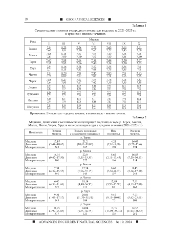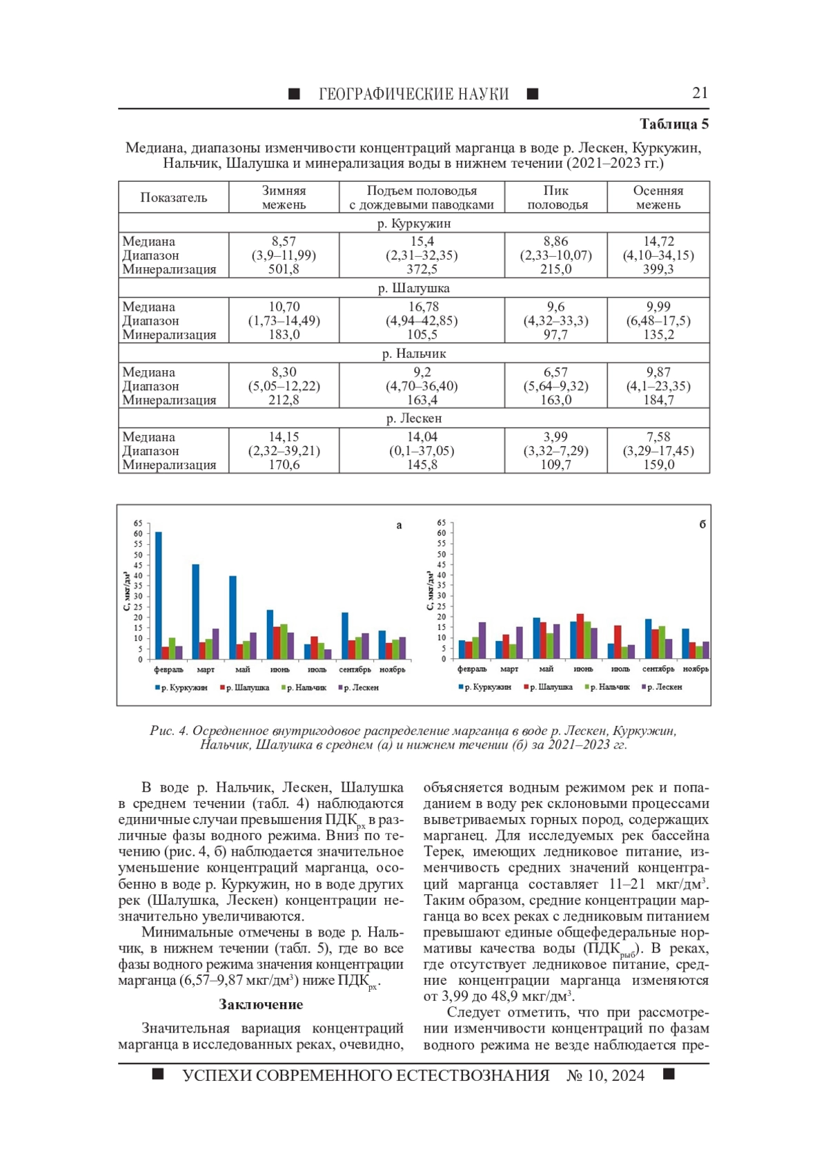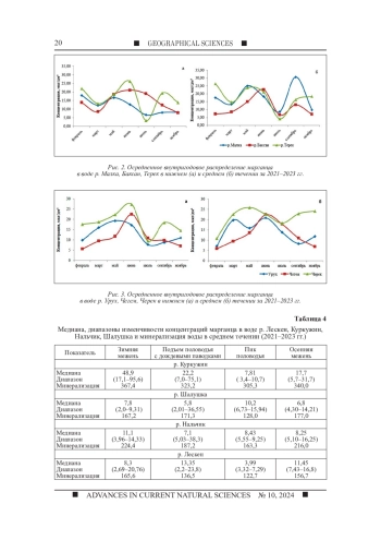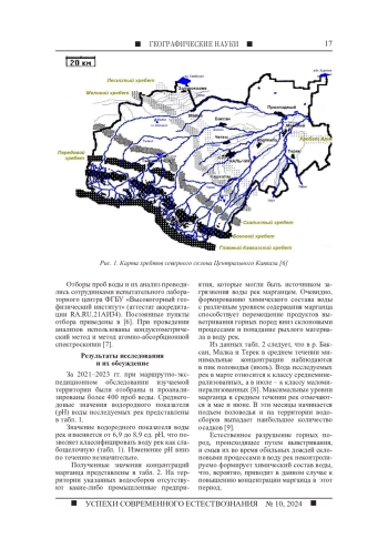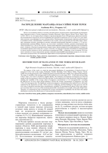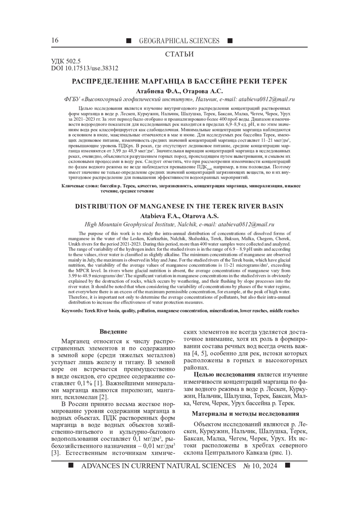 Целью исследования является изучение внутригодового распределения концентраций растворенных форм марганца в воде р. Лескен, Куркужин, Нальчик, Шалушка, Терек, Баксан, Малка, Чегем, Черек, Урух за 2021-2023 гг. За этот период было отобрано и проанализировано более 400 проб воды. Диапазон изменчивости водородного показателя для исследованных рек находится в пределах 6,9-8,9 ед. рН, и по этим значениям вода рек классифицируется как слабощелочная. Минимальные концентрации марганца наблюдаются в основном в июле, максимальные отмечаются в мае и июне. Для исследуемых рек бассейна Терек, имеющих ледниковое питание, изменчивость средних значений концентраций марганца составляет 11-21 мкг/дм3, превышающие уровень ПДКрх. В реках, где отсутствует ледниковое питание, средние концентрации марганца изменяются от 3,99 до 48,9 мкг/дм3. Значительная вариация концентраций марганца в исследованных реках, очевидно, объясняется разрушением горных пород, происходящим путем выветривания, и смывом их склоновыми процессами в воду рек. Следует отметить, что при рассмотрении изменчивости концентраций по фазам водного режима не везде наблюдается превышение ПДКрыб, например, в пик половодья. Поэтому имеет значение не только определение средних значений концентраций загрязняющих веществ, но и их внутригодовое распределение для повышения эффективности водоохранных мероприятий.