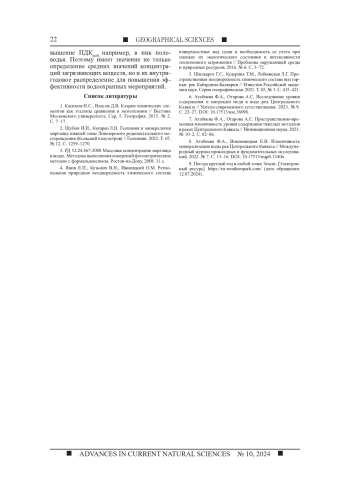 6. Атабиева Ф.А., Отарова А.С. Исследование уровня содержания и миграции меди в воде рек Центрального Кавказа // Успехи современного естествознания. 2023. № 9. С. 22-27. DOI: 10.17513/use.38098 EDN: OSNRIE