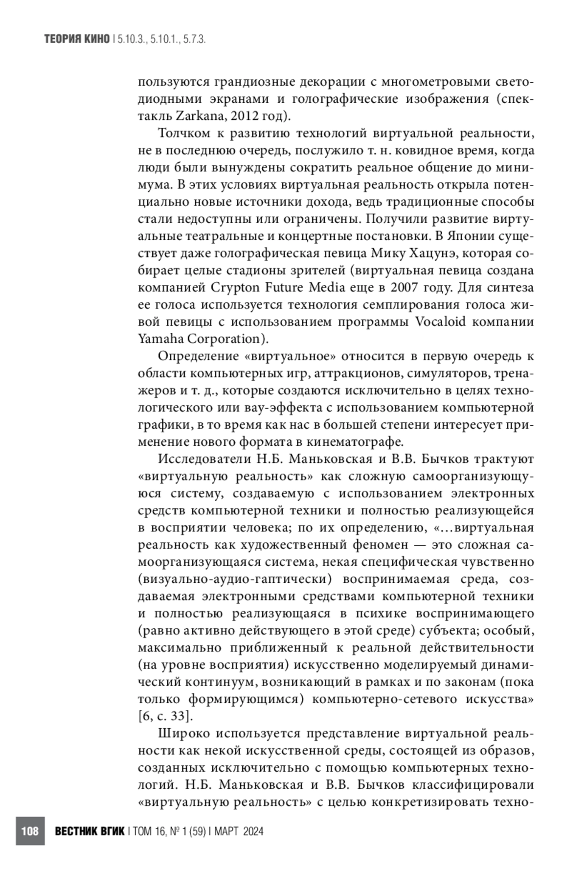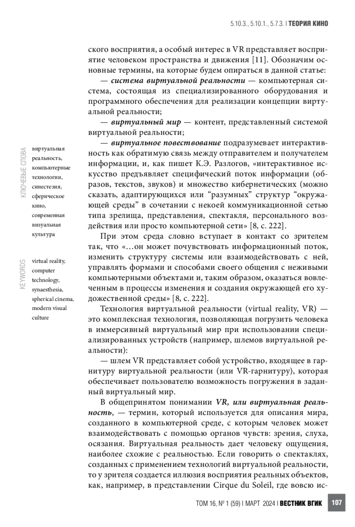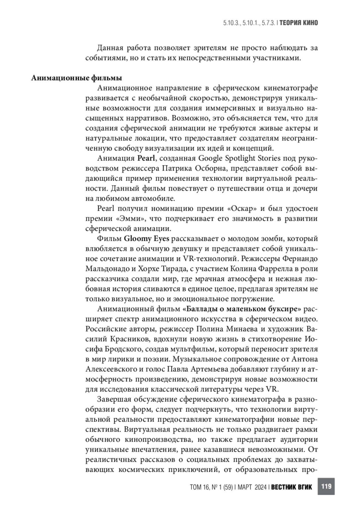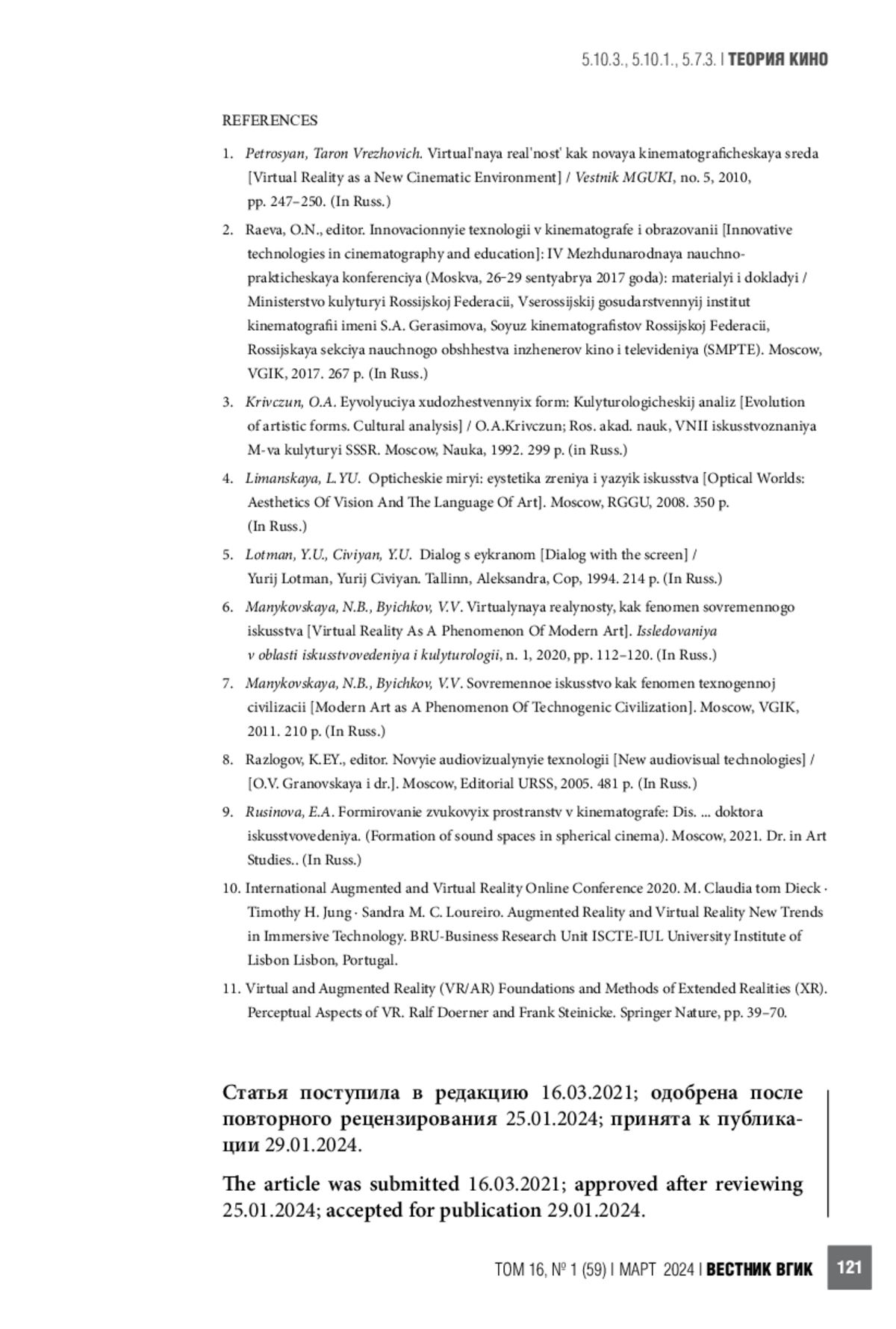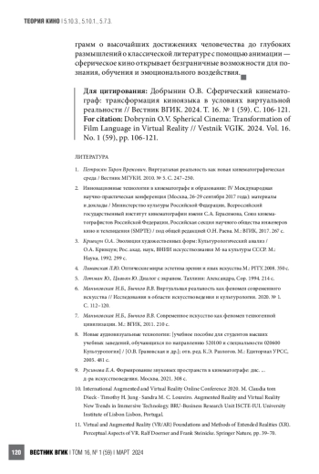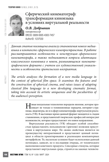 ДОБРЫНИН О. В. СФЕРИЧЕСКИЙ КИНЕМАТОГРАФ: ТРАНСФОРМАЦИЯ КИНОЯЗЫКА В УСЛОВИЯХ ВИРТУАЛЬНОЙ РЕАЛЬНОСТИ // ВЕСТНИК ВГИК. 2024. ТОМ 16, №1 (59)