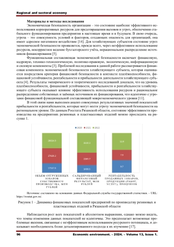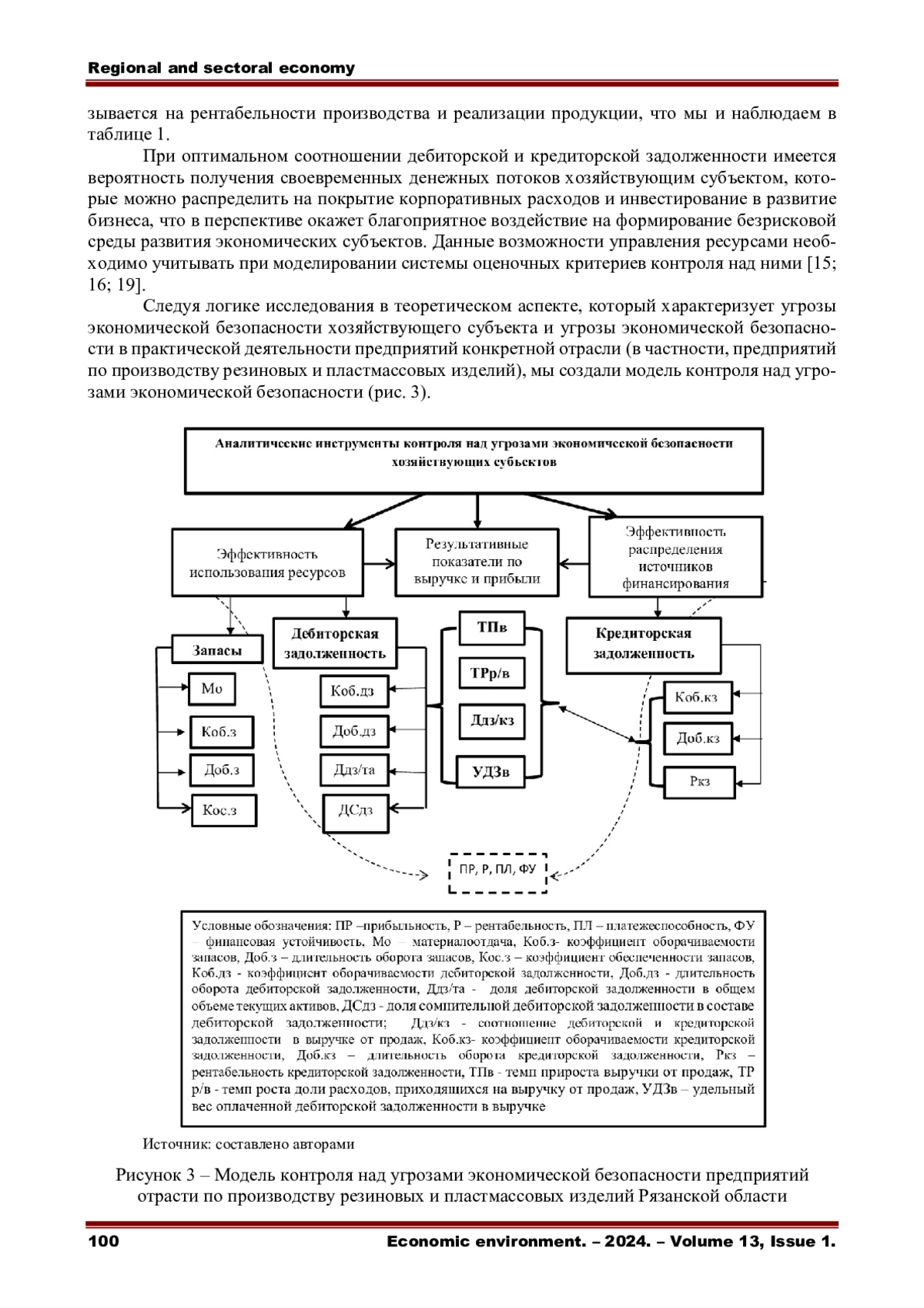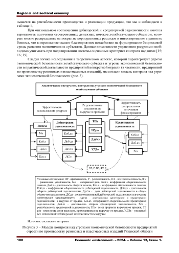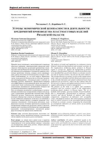 Проведён анализ тенденций и закономерностей в поведении оценочных критериев, характеризующих финансово-хозяйственную деятельность организаций производства пластмассовых изделий Рязанской области. На фоне положительной динамики результативных показателей выявлены идентичные проблемные области, которые могут спровоцировать угрозы экономической безопасности не только в субъектах хозяйствования, но и во всей отрасли. Выявленные угрозы экономической безопасности исследуемых организаций идентифицированы с доказанными ранее в научной литературе угрозами, связанными с финансовыми потерями от неэффективного использования ресурсов, что явилось доказательной базой необходимости усовершенствования и актуализации аналитических инструментов контроля над негативными явлениями в управлении ресурсами. Цель исследования заключается в актуализации и систематизации аналитических инструментов контроля над ресурсами в организациях производства пластмассовых изделий Рязанского региона. Совокупность применяемых методов включает: общенаучные методы исследования (монографический, обобщения материалов, системного исследования) и специальные методы анализа и контроля (сравнения, сопоставление показателей с допустимыми значениями, платформенного анализа). В статье предложены аналитические инструменты контроля над ресурсами в оценке и прогнозировании угроз экономической безопасности, интегрирующие взаимосвязь систематизированных показателей разных форм бухгалтерской (финансовой) отчётности.