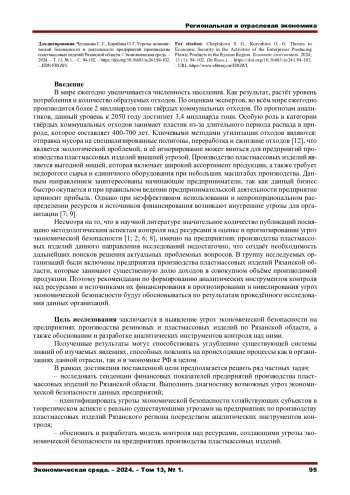 В мире ежегодно увеличивается численность населения. Как результат, растёт уровень потребления и количество образуемых отходов. По оценкам экспертов, во всём мире ежегодно производится более 2 миллиардов тонн твёрдых коммунальных отходов. По прогнозам аналитиков, данный уровень к 2050 году достигнет 3,4 миллиарда тонн. Особую роль в категории твёрдых коммунальных отходов занимает пластик из-за длительного периода распада в природе, которое составляет 400-700 лет. Ключевыми методами утилизации отходов являются: отправка мусора на специализированные полигоны, переработка и сжигание отходов [12], что является экологической проблемой, и её игнорирование может явиться для предприятий производства пластмассовых изделий внешней угрозой. Производство пластмассовых изделий является выгодной нишей, которая включает широкий ассортимент продукции, а также требует недорогого сырья и единичного оборудования при небольших масштабах производства. Данным направлением заинтересованы начинающие предприниматели, так как данный бизнес быстро окупается и при правильном ведении предпринимательской деятельности предприятие приносит прибыль. Однако при неэффективном использовании и непропорциональном распределении ресурсов и источников финансирования возникают внутренние угрозы для организации [7; 9]