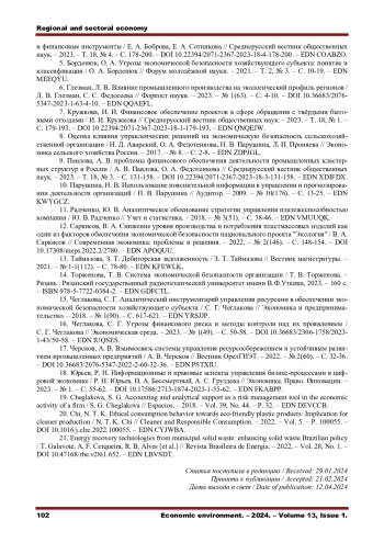 6. Глезман, Л. В. Влияние промышленного производства на экологический профиль регионов / Л. В. Глезман, С. С. Федосеева // Форпост науки. - 2023. - № 1(63). - С. 4-10. DOI: 10.36683/2076-5347-2023-1-63-4-10 EDN: QQAEFL