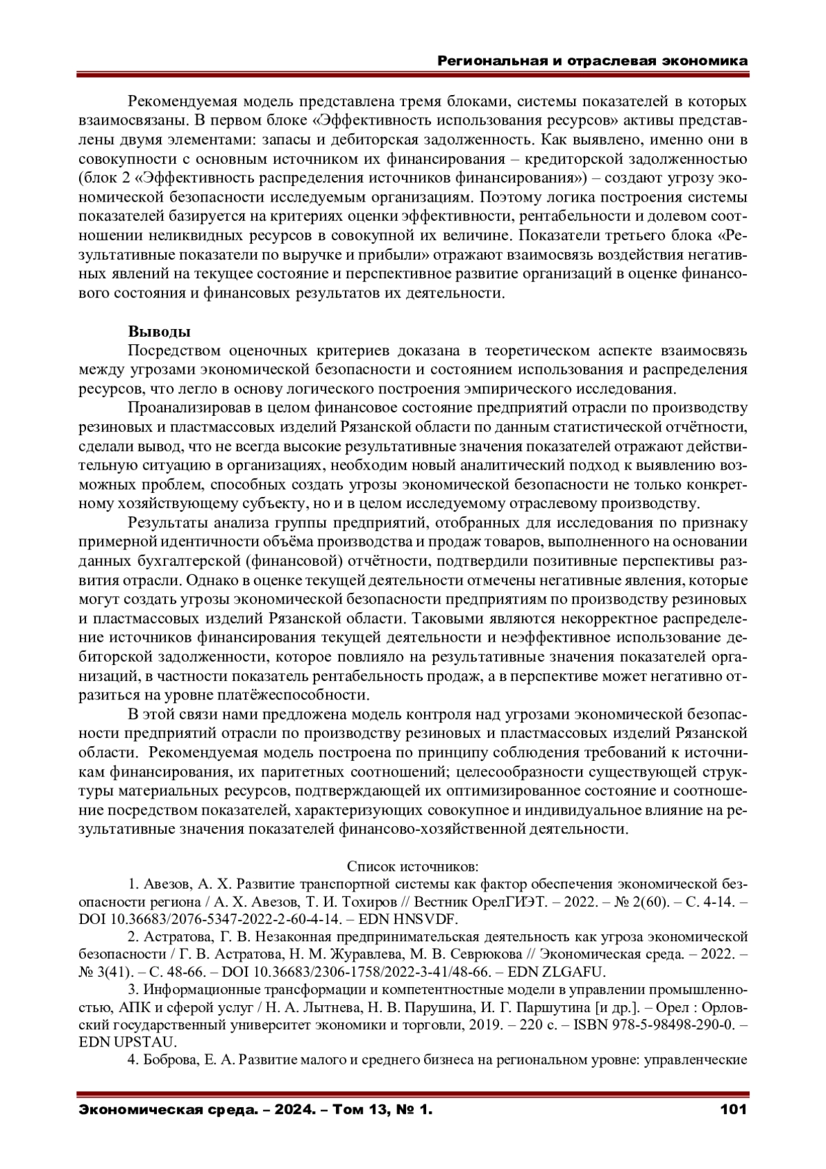 1. Авезов, А. Х. Развитие транспортной системы как фактор обеспечения экономической безопасности региона / А. Х. Авезов, Т. И. Тохиров // Вестник ОрелГИЭТ. - 2022. - № 2(60). - С. 4-14. DOI: 10.36683/2076-5347-2022-2-60-4-14 EDN: HNSVDF