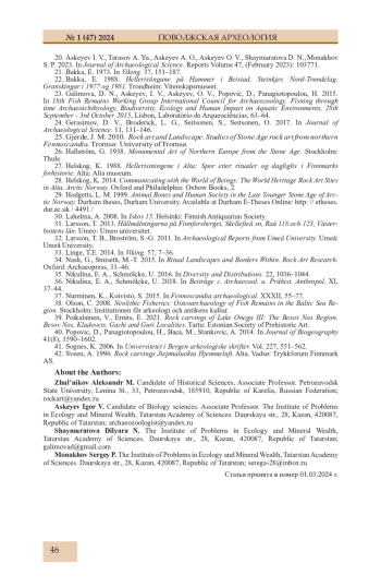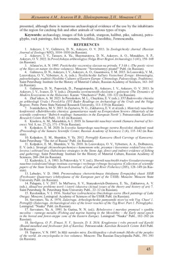 Статья представляет результаты анализа изучения образа рыбы в наскальном творчестве древних охотников и рыболов Северной Европы (финал VI - III тыс. до н. э.). В ходе исследования изучено 134 фигуры рыбы на 6 писаницах и в 17 скоплениях петроглифов Фенноскандии. Малая доля фигур рыбы по отношению к общему числу изображений на скалах региона, при высокой доле рыболовства в первобытной экономике, установленной по костным остаткам на нео-энеолитических стоянках, позволяет предполагать мифологическую подоснову рассматриваемых образов. Пространственные различия в облике фигур рыб на территории Северной Европы позволяют выделить две области (западную и восточную), кардинально отличающиеся по стилю изображения ихтиоморфов. В наскальном творчестве нашли отражение в основном представители наиболее крупных видов рыб, обитавших на территории региона: сом, осетр, палтус, щука, лосось, сиг. В костных остатках на стоянках, расположенных неподалеку от скоплений наскальных изображений, доминирующими являются обычно другие виды рыб: судак, треска. В композициях промысла рыбы, как и в других охотничьих сценах, выбитых на петроглифах Фенноскандии, представлены только активные способы ее добычи, хотя имеются многочисленные археологические данные использования жителями региона для ловли рыбы и иных животных разного типа ловушек.