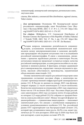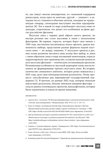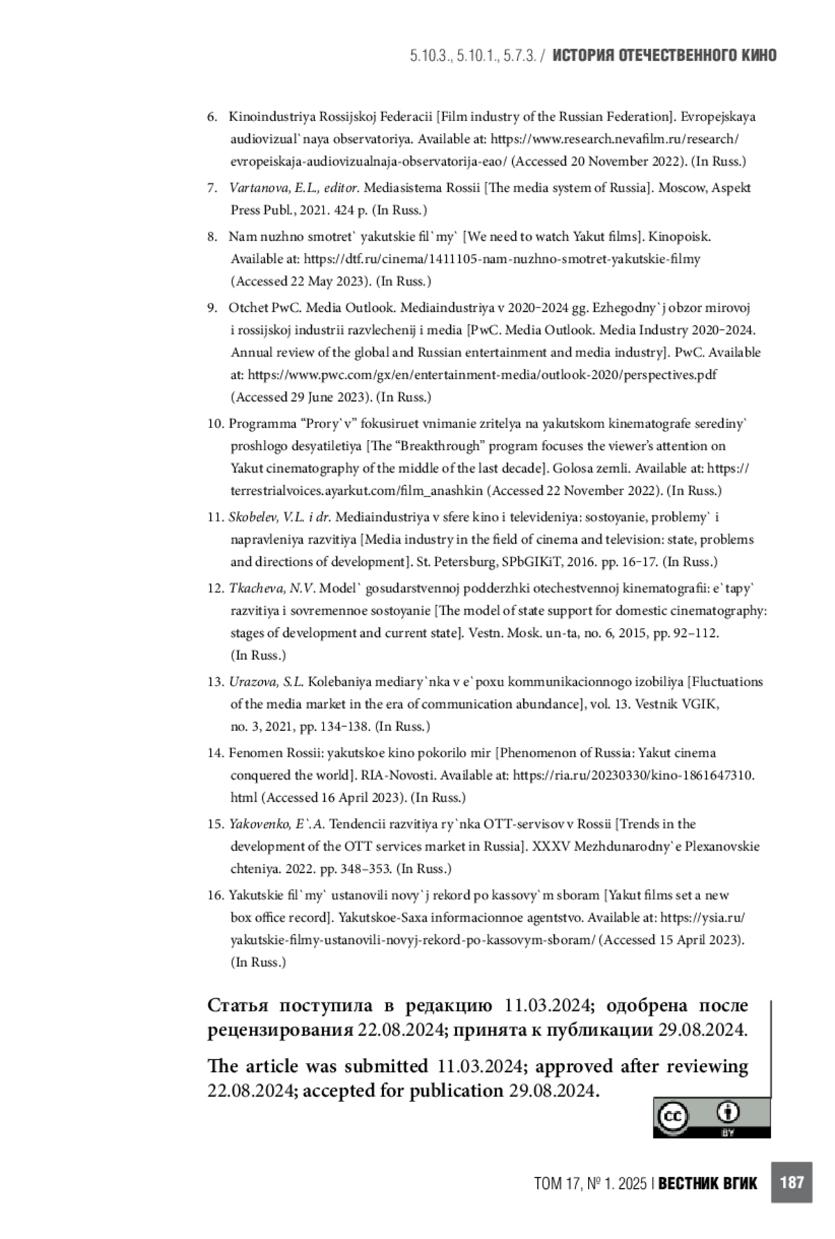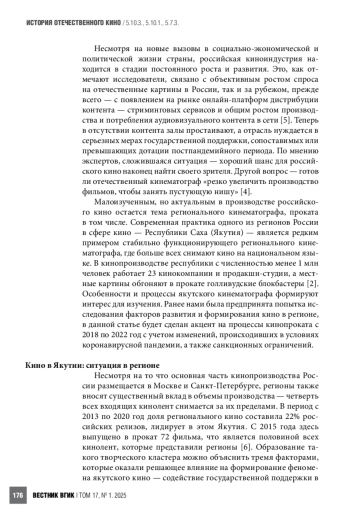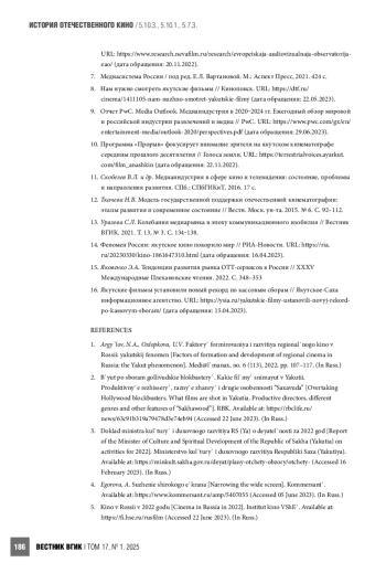 1. Аргылов Н.А., Охлопкова У.В. Факторы формирования и развития регионального кино в России: якутский феномен // Меди@льманах. 2022. № 6 (113). С. 107-117.