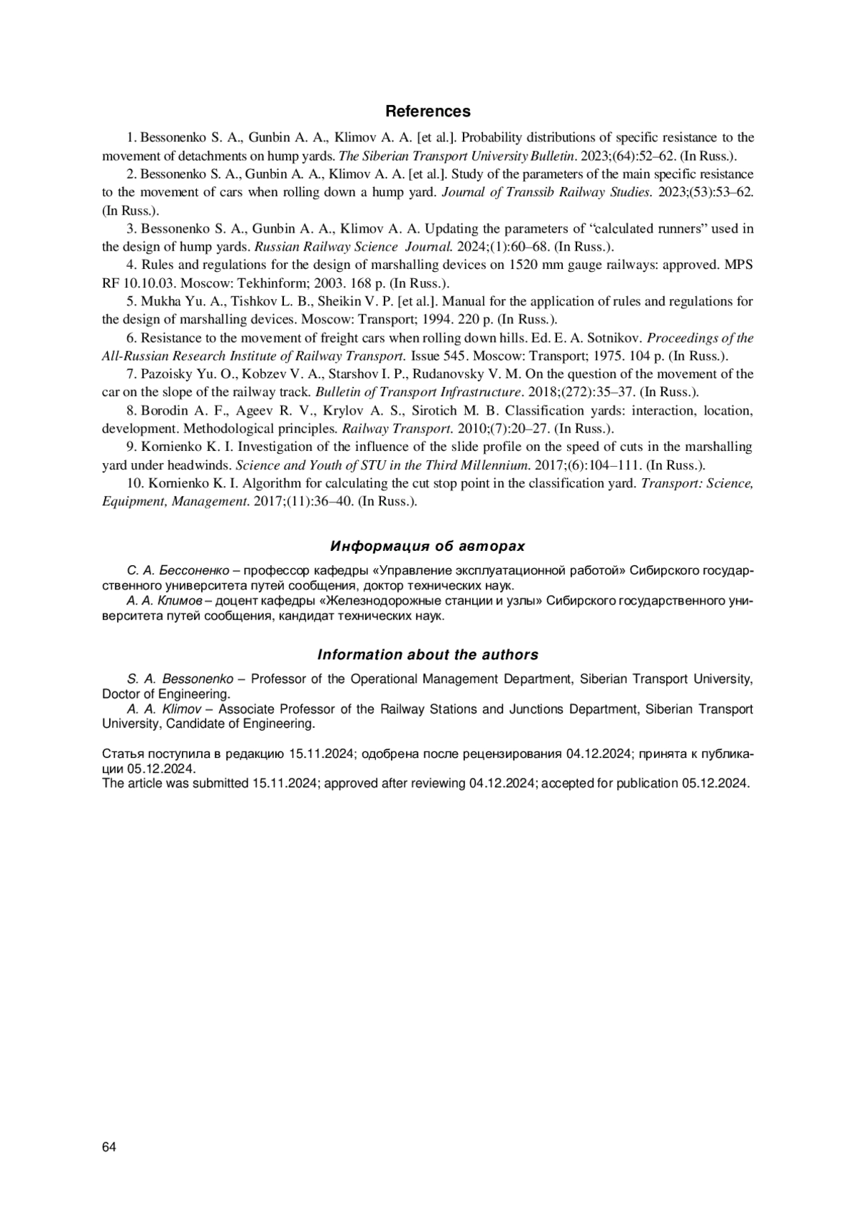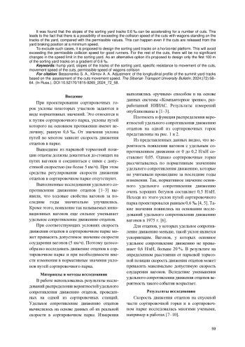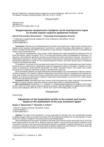 Статья: КОРРЕКТИРОВКА ПРОДОЛЬНОГО ПРОФИЛЯ ПУТЕЙ ПОДГОРОЧНОГО ПАРКА НА ОСНОВЕ ОЦЕНКИ СКОРОСТИ ДВИЖЕНИЯ ОТЦЕПОВ (2024)