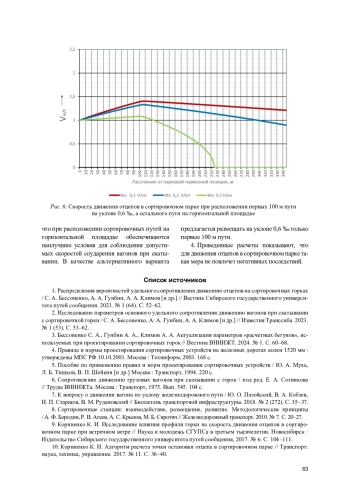 Для исключения подобных случаев предлагается проектировать пути сортировочного парка на горизонтальной площадке. Это позволит избежать превышения допустимой скорости соударения для хороших бегунов. Для остальных отцепов значительных изменений скоростного режима в сортировочном парке не произойдет. В качестве альтернативного варианта предложено проектировать на уклоне 0,6 % только первые 100 м путей сортировочного парка.