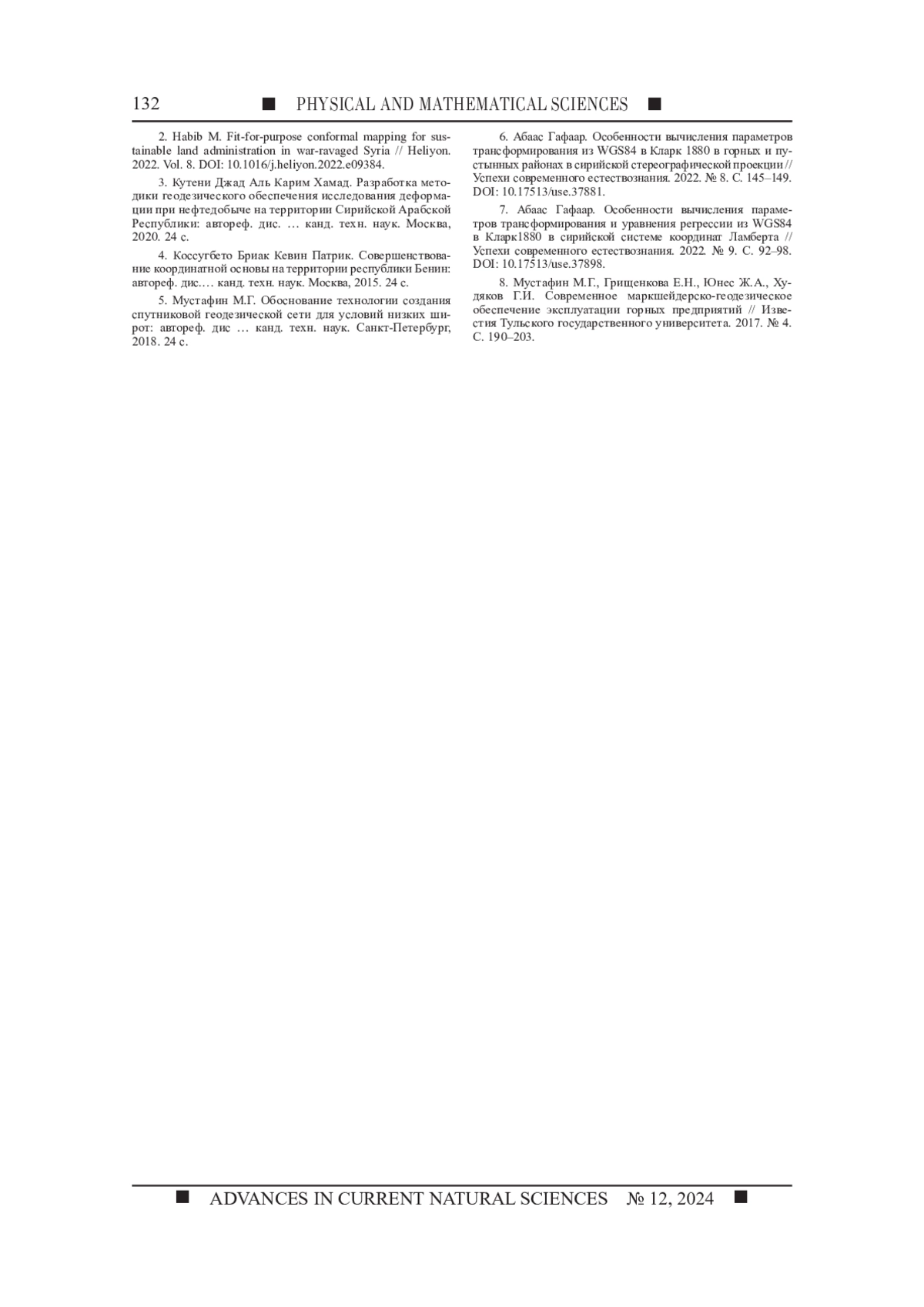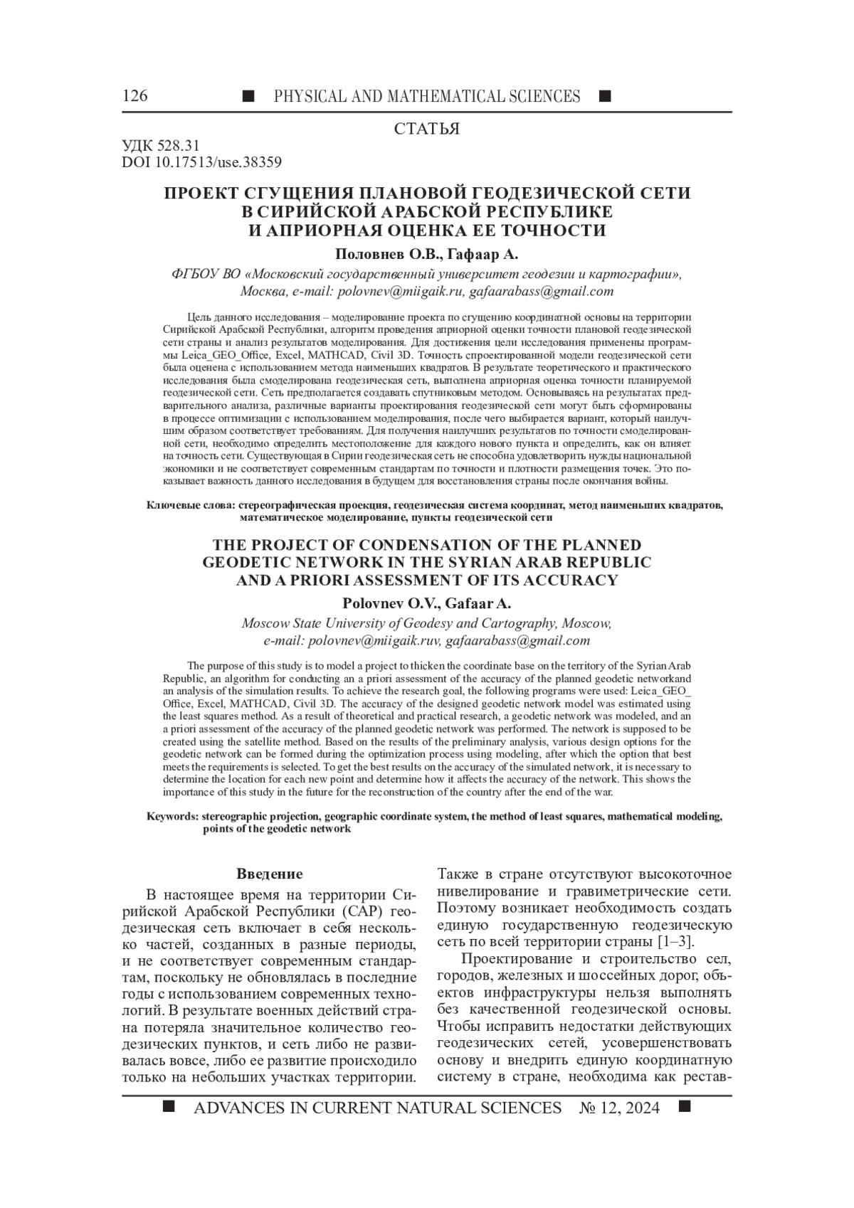 Статья: ПРОЕКТ СГУЩЕНИЯ ПЛАНОВОЙ ГЕОДЕЗИЧЕСКОЙ СЕТИ В СИРИЙСКОЙ АРАБСКОЙ РЕСПУБЛИКЕ И АПРИОРНАЯ ОЦЕНКА ЕЕ ТОЧНОСТИ (2024)