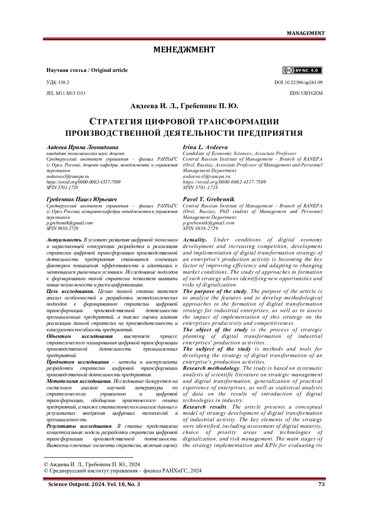 Актуальность. В условиях развития цифровой экономики и нарастающей конкуренции разработка и реализация стратегии цифровой трансформации производственной деятельности предприятия становится ключевым фактором повышения эффективности и адаптации к меняющимся рыночным условиям. Исследование подходов к формированию такой стратегии позволяет выявить новые возможности и риски цифровизации. Цель исследования. Целью данной статьи является анализ особенностей и разработка методологических подходов к формированию стратегии цифровой трансформации производственной деятельности промышленных предприятий, а также оценка влияния реализации данной стратегии на производительность и конкурентоспособность предприятий. Объектом исследования выступает процесс стратегического планирования цифровой трансформации производственной деятельности промышленных предприятий. Предметом исследования - методы и инструменты разработки стратегии цифровой трансформации производственной деятельности предприятия. Методология исследования. Исследование базируется на системном анализе научной литературы по стратегическому управлению и цифровой трансформации, обобщении практического опыта предприятий, а также статистическом анализе данных о результатах внедрения цифровых технологий в промышленности. Результаты исследования. В статье представлена концептуальная модель разработки стратегии цифровой трансформации производственной деятельности. Выявлены ключевые элементы стратегии, включая оценку цифровой зрелости, выбор приоритетных направлений и технологий цифровизации, управление рисками. Определены основные этапы реализации стратегии и KPI для оценки её эффективности. Показано, как грамотно разработанная и реализованная стратегия цифровой трансформации ведёт к оптимизации производственных процессов, повышению производительности труда и конкурентоспособности предприятия.