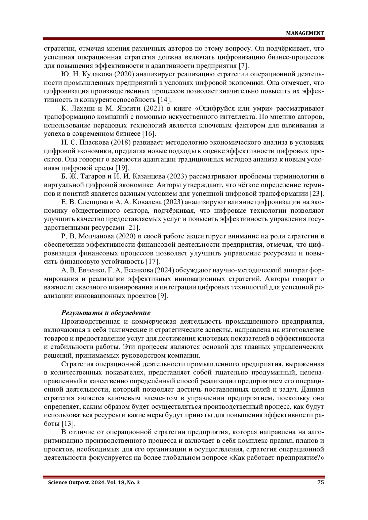 12. Кулакова, Ю. Н. Реализация стратегии операционной деятельности промышленного предприятия в цифровой экономике / Ю. Н. Кулакова // Вестник Тверского государственного университета. Серия: Экономика и управление. - 2020. - № 3(51). - С. 78-87. DOI: 10.26456/2219-1453/2020.3.078 EDN: MGOQIY