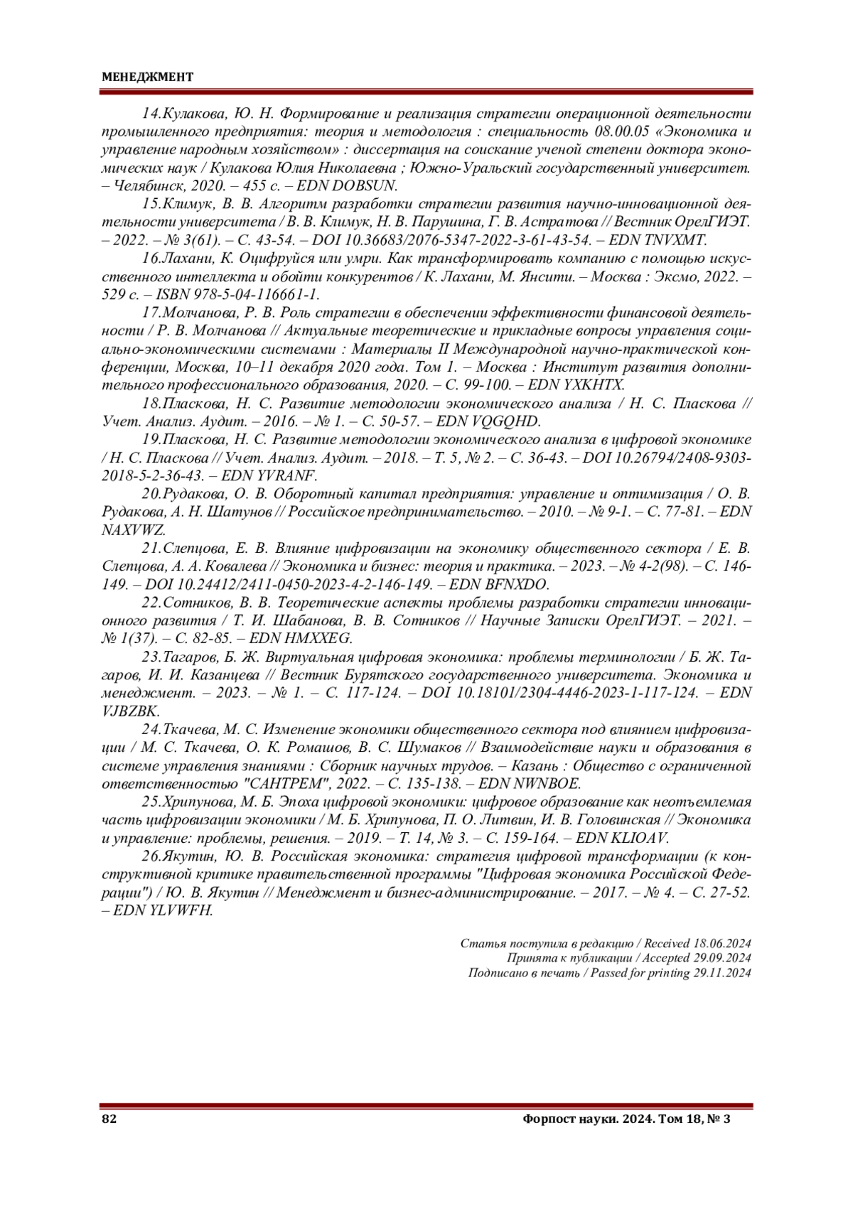 15. Климук, В. В. Алгоритм разработки стратегии развития научно-инновационной деятельности университета / В. В. Климук, Н. В. Парушина, Г. В. Астратова // Вестник ОрелГИЭТ. - 2022. - № 3(61). - С. 43-54. DOI: 10.36683/2076-5347-2022-3-61-43-54 EDN: TNVXMT