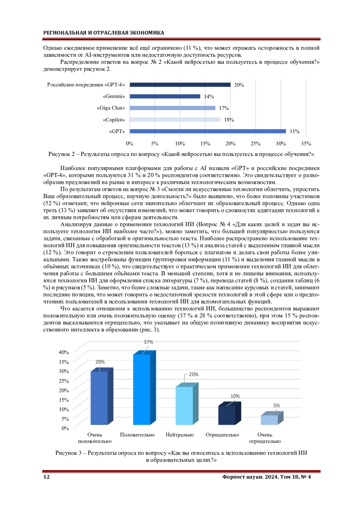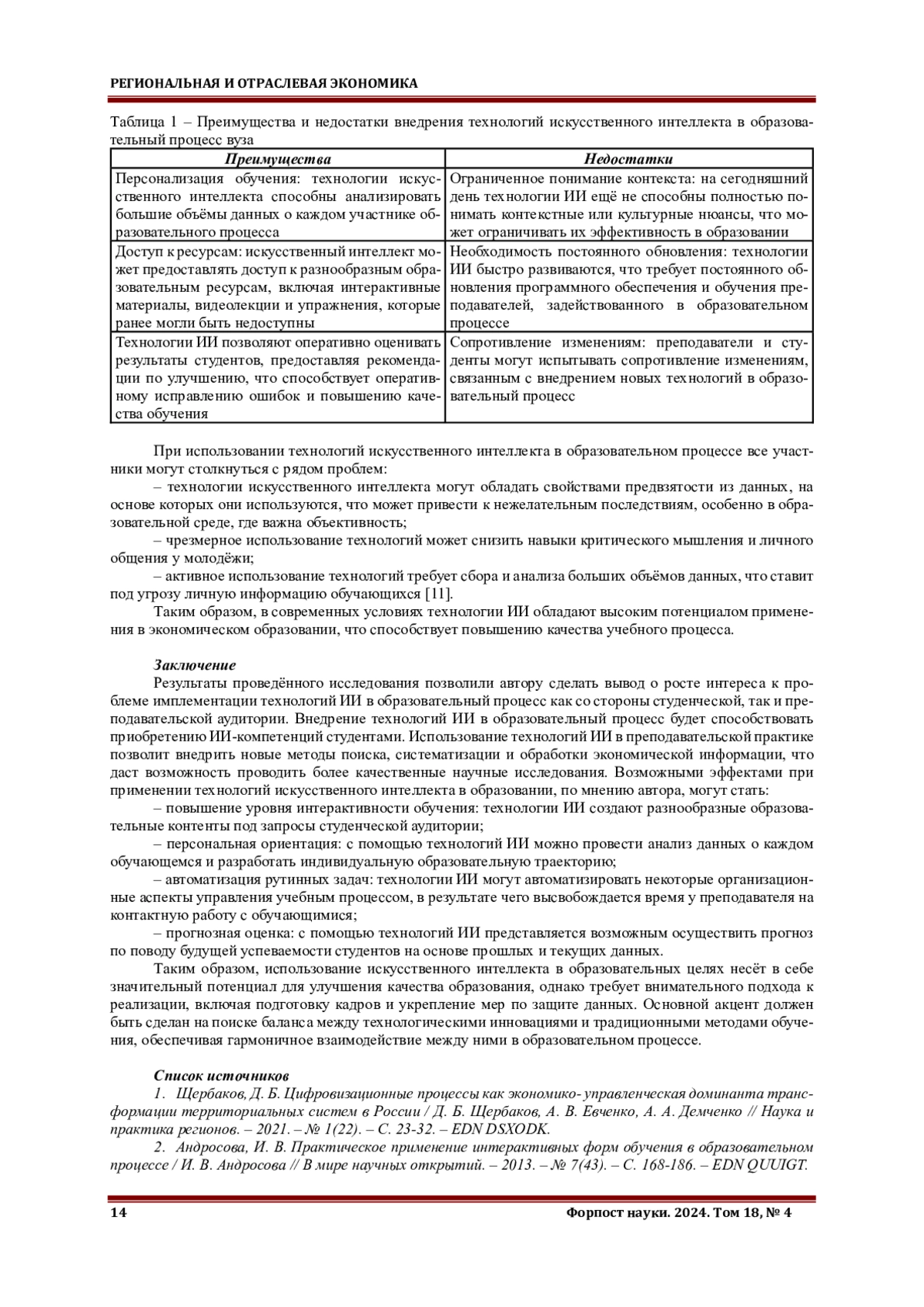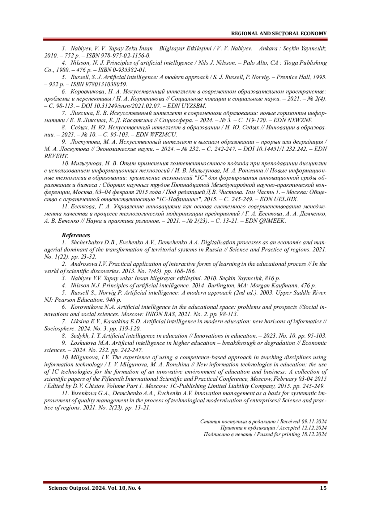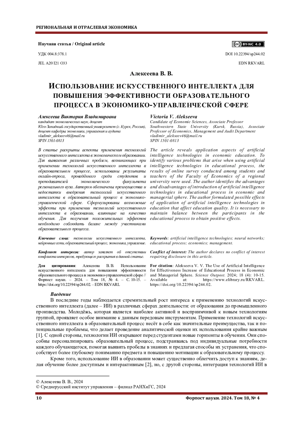 АЛЕКСЕЕВА В. В. ИСПОЛЬЗОВАНИЕ ИСКУССТВЕННОГО ИНТЕЛЛЕКТА ДЛЯ ПОВЫШЕНИЯ ЭФФЕКТИВНОСТИ ОБРАЗОВАТЕЛЬНОГО ПРОЦЕССА В ЭКОНОМИКО-УПРАВЛЕНЧЕСКОЙ СФЕРЕ // ФОРПОСТ НАУКИ. 2024. Т. 18 № 4