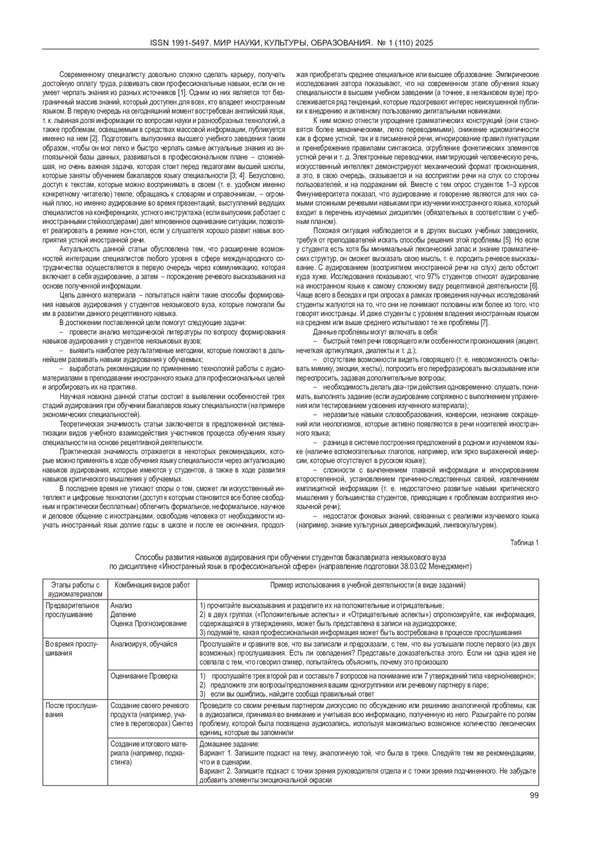 РЕМИЗОВА М. С. АУДИРОВАНИЕ КАК СЛОЖНЕЙШИЙ ЭЛЕМЕНТ ЛИНГВОДИДАКТИКИ ПРИ ОБУЧЕНИИ ЯЗЫКУ СПЕЦИАЛЬНОСТИ: СПОСОБЫ АКТИВИЗАЦИИ РЕЦЕПТИВНОГО НАВЫКА // МИР НАУКИ, КУЛЬТУРЫ, ОБРАЗОВАНИЯ. 2025. № 1 (110)