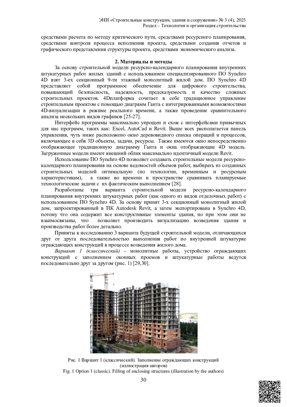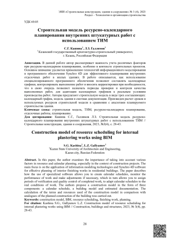 В данной работе автор рассматривает важность учета различных факторов при ресурсно-календарном планировании, особенно в контексте строительных проектов. Основное внимание уделяется применению технологий информационного моделирования и программного обеспечения Synchro 4D для эффективного планирования внутренних отделочных работ в жилых зданиях. В работе описывается, как использование специализированного программного обеспечения позволяет составлять календарные графики, контролировать выполнение работ и вносить корректировки при необходимости, что в свою очередь позволяет назначать периоды проверки и контроля качества выполненных работ, для адаптации календарных графиков к реальным условиям производства работ. Авторы предлагают строительную модель в виде трех составляющих: календарный график, модель здания и сметная документация. Произведен расчет сроков и используемых ресурсов строительной модели в сравнении с аналогами планируемого строительства здания.