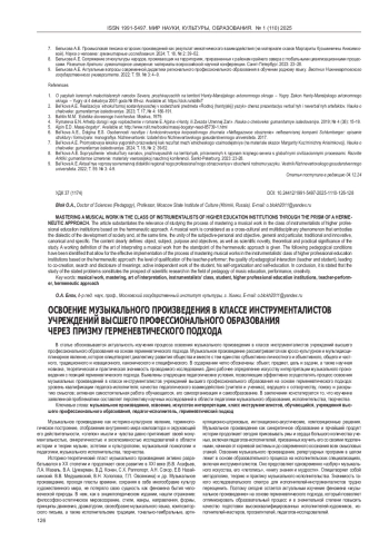 В статье обосновывается актуальность изучения процесса освоения музыкального произведения в классе инструменталистов учреждений высшего профессионального образования на основе герменевтического подхода. Музыкальное произведение рассматривается как кросс-культурное и мультидисциплинарное явление, которое олицетворяет диалектику развития общества и вместе с тем единство субъективно-личностного и объективного, общего и частного, традиционного и новационного, канонического и специфического. В содержании четко обозначены: объект, предмет, цель и задачи, а также научная новизна, теоретическая и практическая значимость проводимого исследования. Дано рабочее определение искусству интерпретации музыкального произведения с позиций герменевтического подхода. Выявлены следующие педагогические условия, позволяющие эффективно осуществлять процесс освоения музыкальных произведений в классе инструменталистов учреждений высшего профессионального образования на основе герменевтического подхода: уровень квалификации педагога-исполнителя; качество педагогического взаимодействия (учителя и ученика), ведущего к сотворчеству, поиску и раскрытию смыслов; активная самостоятельная работа обучающегося, его самоорганизация и самообразование. В заключении констатируется то, что изучение заявленной проблематики составляет перспективу научных исследований в области педагогики музыкального образования, исполнительства, творчества.