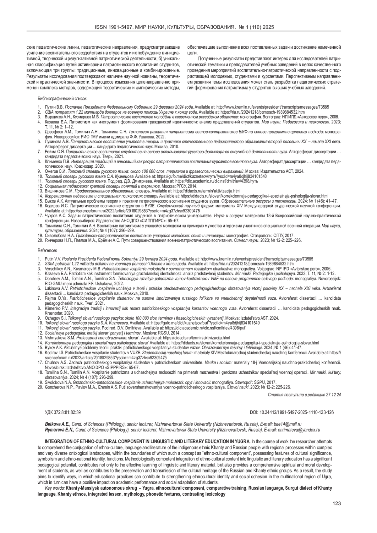 В данной статье нами предпринята попытка осмысления сопряжения этнокультуры, языка и литературы коренного этноса ханты и русского народа с региональными процессами в пределах сложных и весьма разнообразных онтологических ландшафтов, в границах которых функционируют такое понятие, как «этнокультурный компонент», обладающий признаками культурной значимости, символичности и этнонациональной идентичности. Методически грамотная интеграция этнокультурного содержания в лингвистическое и литературоведческое образование обладает значительным педагогическим потенциалом, способствует не только эффективному усвоению языкового и литературного материала, но и обеспечивает комплексное духовно-нравственное развитие обучающихся, а также содействует сохранению и трансляции культурного наследия русского и хантыйского этносов. В результате исследование направлено на выявление способов, которыми образовательные практики могут способствовать укреплению этнокультурной идентичности и социальной сплоченности в многонациональном регионе Югры, что, в свою очередь, может оказать положительное влияние на академическую успеваемость и социальную адаптацию обучающихся.