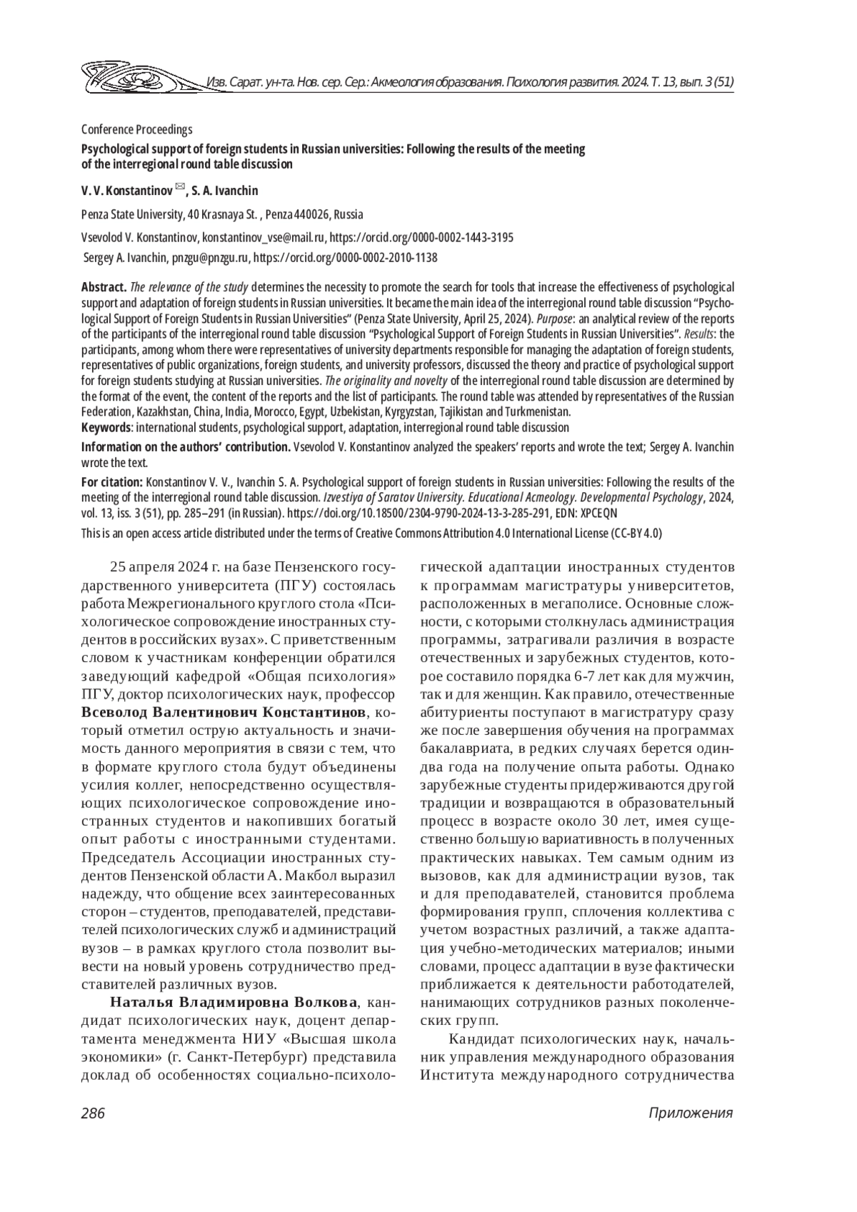 25 апреля 2024 г. на базе Пензенского государственного университета (ПГУ) состоялась работа Межрегионального круглого стола «Психологическое сопровождение иностранных студентов в российских вузах». С приветственным словом к участникам конференции обратился заведующий кафедрой «Общая психология» ПГУ, доктор психологических наук, профессор Всеволод Валентинович Константинов, который отметил острую актуальность и значимость данного мероприятия в связи с тем, что в формате круглого стола будут объединены усилия коллег, непосредственно осуществляющих психологическое сопровождение иностранных студентов и накопивших богатый опыт работы с иностранными студентами.